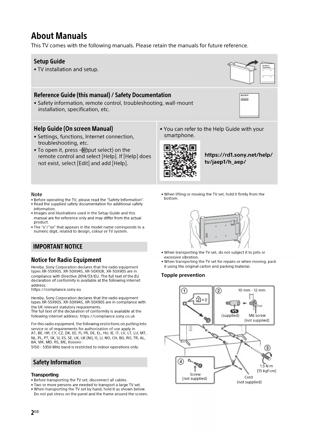 - Before operating the TV, please read the “Safety Information”.• Read the supplied safety documentation for additional safety information. • Images and illustrations used in the Setup Guide and this manual are for reference only and may differ from the actual product.• The “x”/“xx” that appears in the model name corresponds to a numeric digit, related to design, colour or TV system. Notice for Radio Equipment Hereby, Sony Corporation declares that the radio equipment types XR-55X90S, XR-50X94S, XR-50X92K, XR-50X90S are in compliance with Directive 2014/53/EU. The full text of the EU declaration of conformity is available at the following internet address: https://compliance.sony.euHereby, Sony Corporation declares that the radio equipment types XR-55X90S, XR-50X94S, XR-50X90S are in compliance with the UK relevant statutory requirements.The full text of the declaration of conformity is available at the following internet address: https://compliance.sony.co.ukFor this radio equipment, the following restrictions on putting into service or of requirements for authorization of use apply in AT, BE, HR, CY, CZ, DK, EE, FI, FR, DE, EL, HU, IE, IT, LV, LT, LU, MT, NL, PL, PT, SK, SI, ES, SE, UK, UK (NI), IS, LI, NO, CH, BG, RO, TR, AL, BA, MK, MD, RS, ME, Kosovo :5150 - 5350 MHz band is restricted to indoor operations only. Transporting
