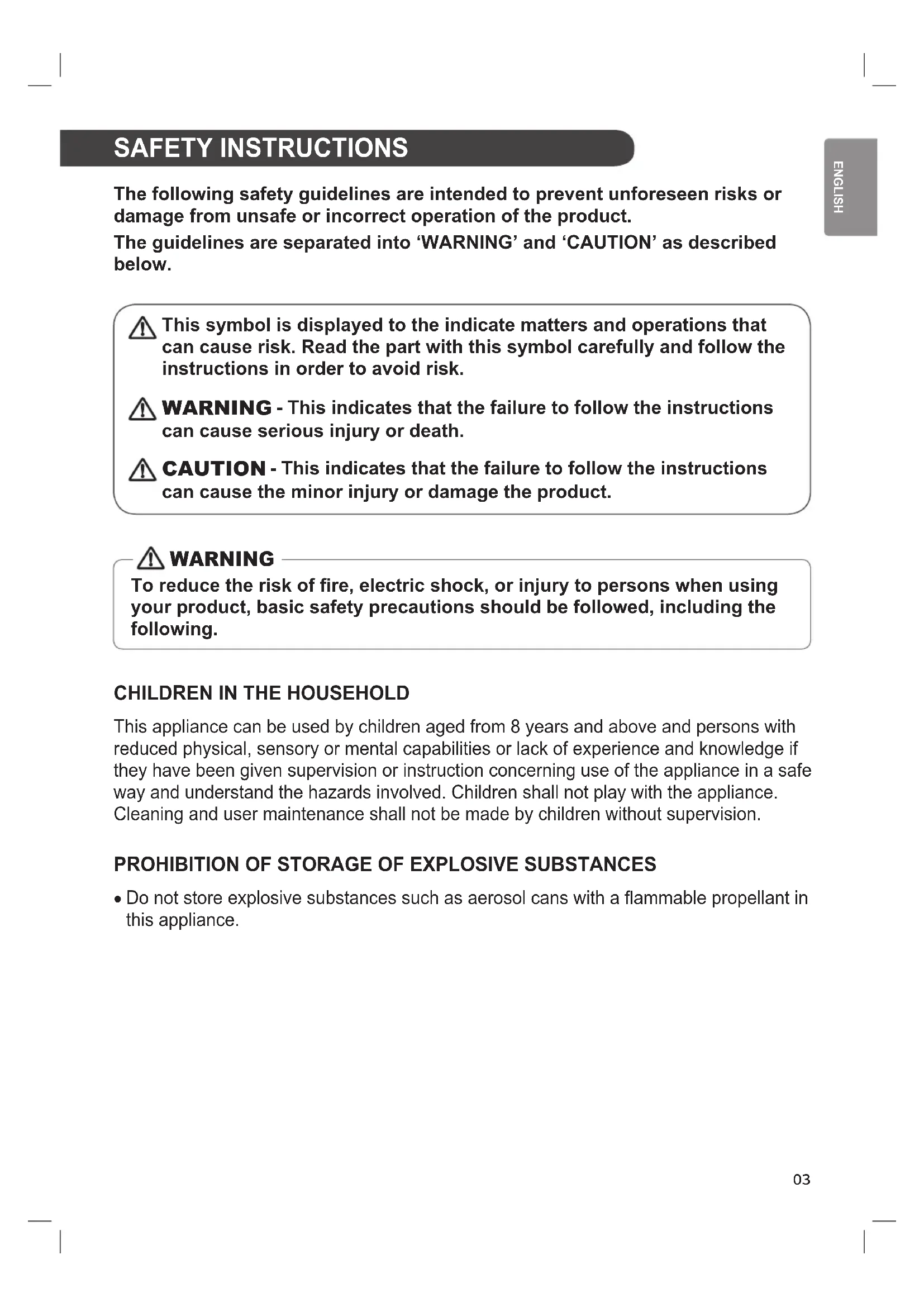 Immediately unplug the power plug and contact an LG Electronics service centre if you detect any abnormal noise, odour or smoke. This may indicate re danger.09 ENGLISH