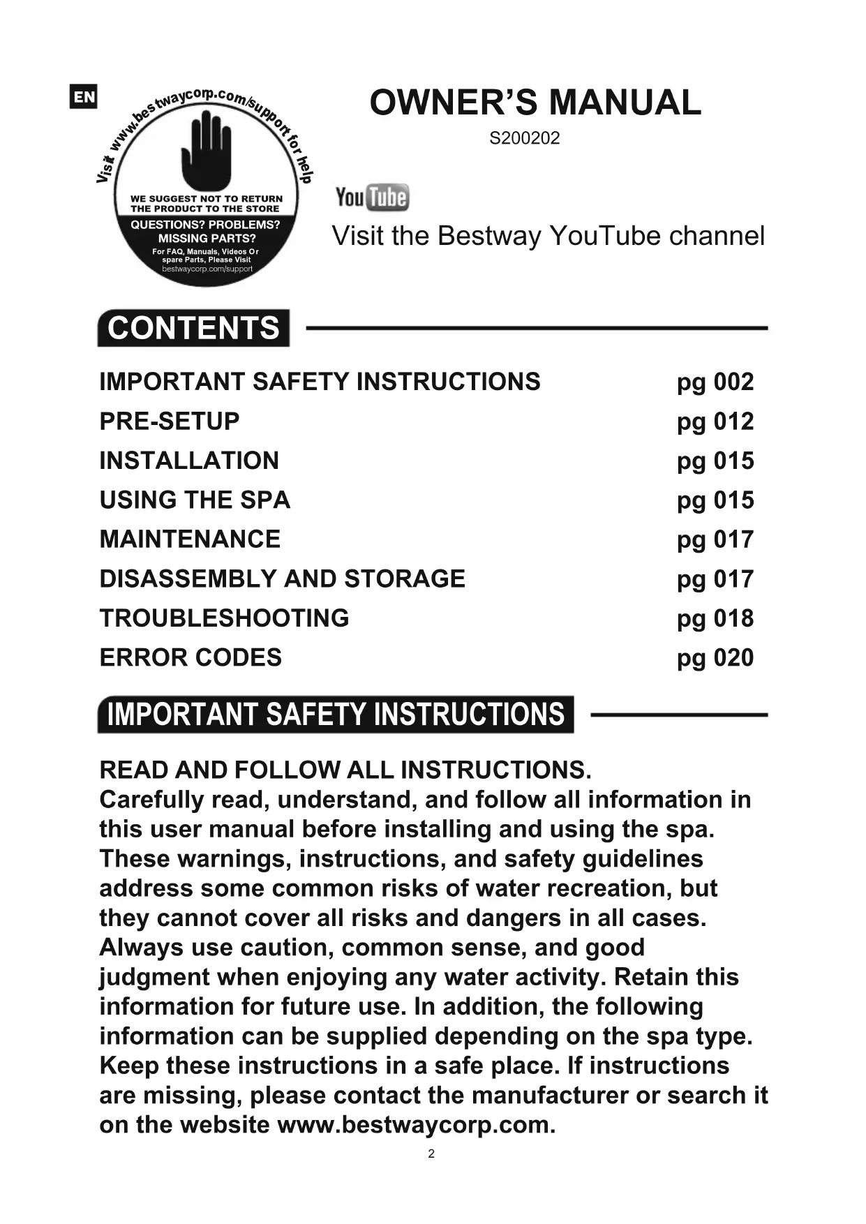 bestwaycorp.com/supportREAD AND FOLLOW ALL INSTRUCTIONS. Carefully read, understand, and follow all information in this user manual before installing and using the spa. These warnings, instructions, and safety guidelines address some common risks of water recreation, but they cannot cover all risks and dangers in all cases. Always use caution, common sense, and good judgment when enjoying any water activity. Retain this information for future use. In addition, the following information can be supplied depending on the spa type. Keep these instructions in a safe place. If instructions are missing, please contact the manufacturer or search it on the website www.bestwaycorp.com.