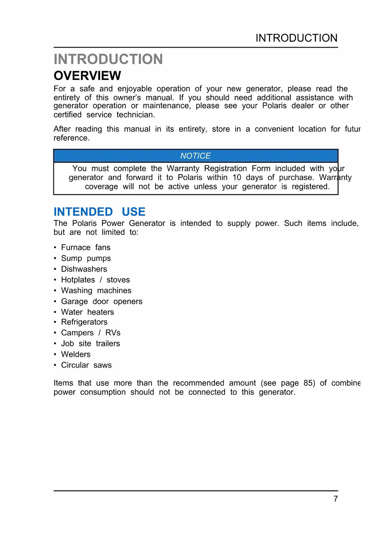 SAFETYEQUIPMENT MODIFICATIONS Your POLARIS generator is designed to provide safe operation when used as directed. Modifications to your generator may negatively impact generator stability. Failure of critical machine components may result from operation with any modifications, especially those that increase power. Do not install any non-POLARIS-approved accessory or modify the generator for the purpose of increasing power output. Any modifications or installation of non-POLARIS-approved accessories could create a substantial safety hazard and increase the risk of bodily injury. Modifying the generator by adding or removing any parts, components, or any modifications not approved by Polaris may void the warranty. Such modifications may make the generator unsafe to operate and could result in severe injury to operators and bystanders, as well as damage to the generator. Some modifications may not be legal in your area. If in doubt, contact your authorized POLARIS dealer. NOTICE For more information about safety, call POLARIS at 1-800-342-3764.