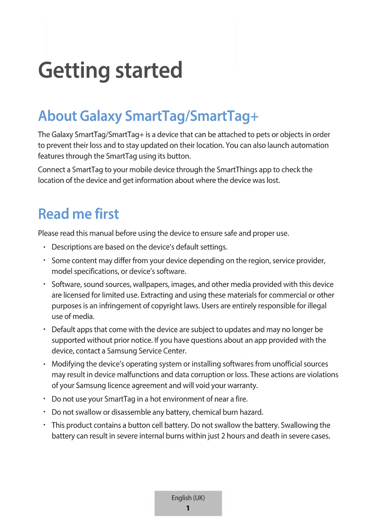 Français (Canada) Português (Brasil) 한국어3 Getting started About Galaxy SmartTag/SmartTag+ The Galaxy SmartTag/SmartTag+ is a device that can be attached to pets or objects in order to prevent their loss and to stay updated on their location. You can also launch automation features through the SmartTag using its button. Connect a SmartTag to your mobile device through the SmartThings app to check the location of the device and get information about where the device was lost. Read me first Please read this manual before using the device to ensure safe and proper use.