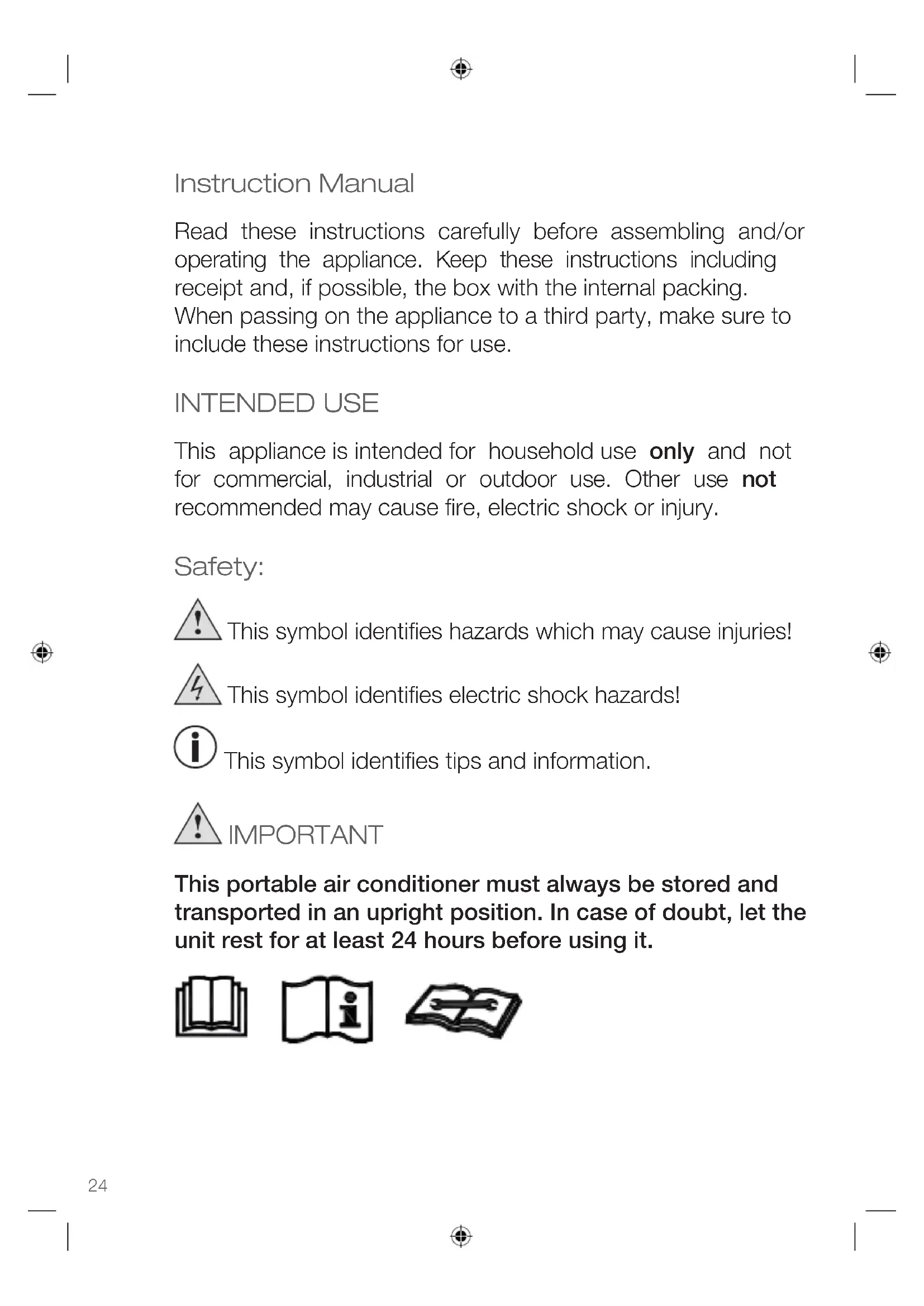 - Connect the appliance to a properly installed wall socket and make sure your local voltage matches the technical data of the appliance. - Push the Power button and the appliance operates in the last used mode. - If you use the appliance for the first time, it is in the cooling mode. The indicator light of the chosen mode lights up by moving the slats of the air outlet respectively You can easily turn or move the appliance with the sturdy castor wheels to direct the airstream into the room. - Turn off the appliance by pushing the Power button. - After use, disconnect the appliance from the mains.Instruction Manual ENGLISH