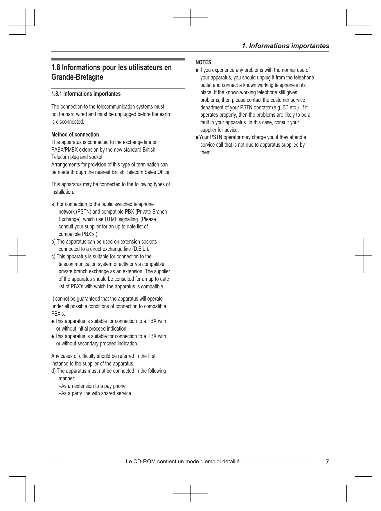 - If you experience any problems with the normal use of your apparatus, you should unplug it from the telephone outlet and connect a known working telephone in its place. If the known working telephone still gives problems, then please contact the customer service department of your PSTN operator (e.g. BT etc.). If it operates properly, then the problems are likely to be a fault in your apparatus. In this case, consult your supplier for advice.
