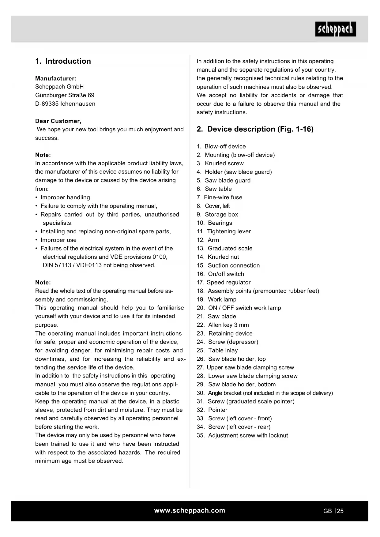 Manufacturer: Scheppach GmbH Günzburger Straße 69 D-89335 Ichenhausen Dear Customer, We hope your new tool brings you much enjoyment and success. Note: In accordance with the applicable product liability laws, the manufacturer of this device assumes no liability for damage to the device or caused by the device arising from: