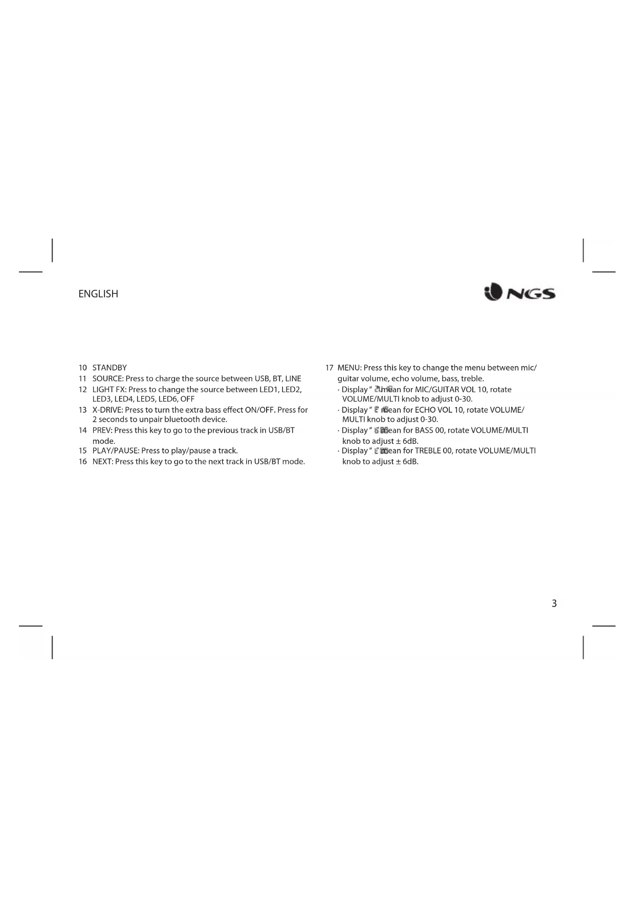 X-DRIVE: Press to turn the extra bass eect ON/OFF. Press for 2 seconds to unpair bluetooth device. PREV: Press this key to go to the previous track in USB/BT mode. PLAY/PAUSE: Press to play/pause a track. NEXT: Press this key to go to the next track in USB/BT mode. MENU: Press this key to change the menu between mic/ guitar volume, echo volume, bass, treble.