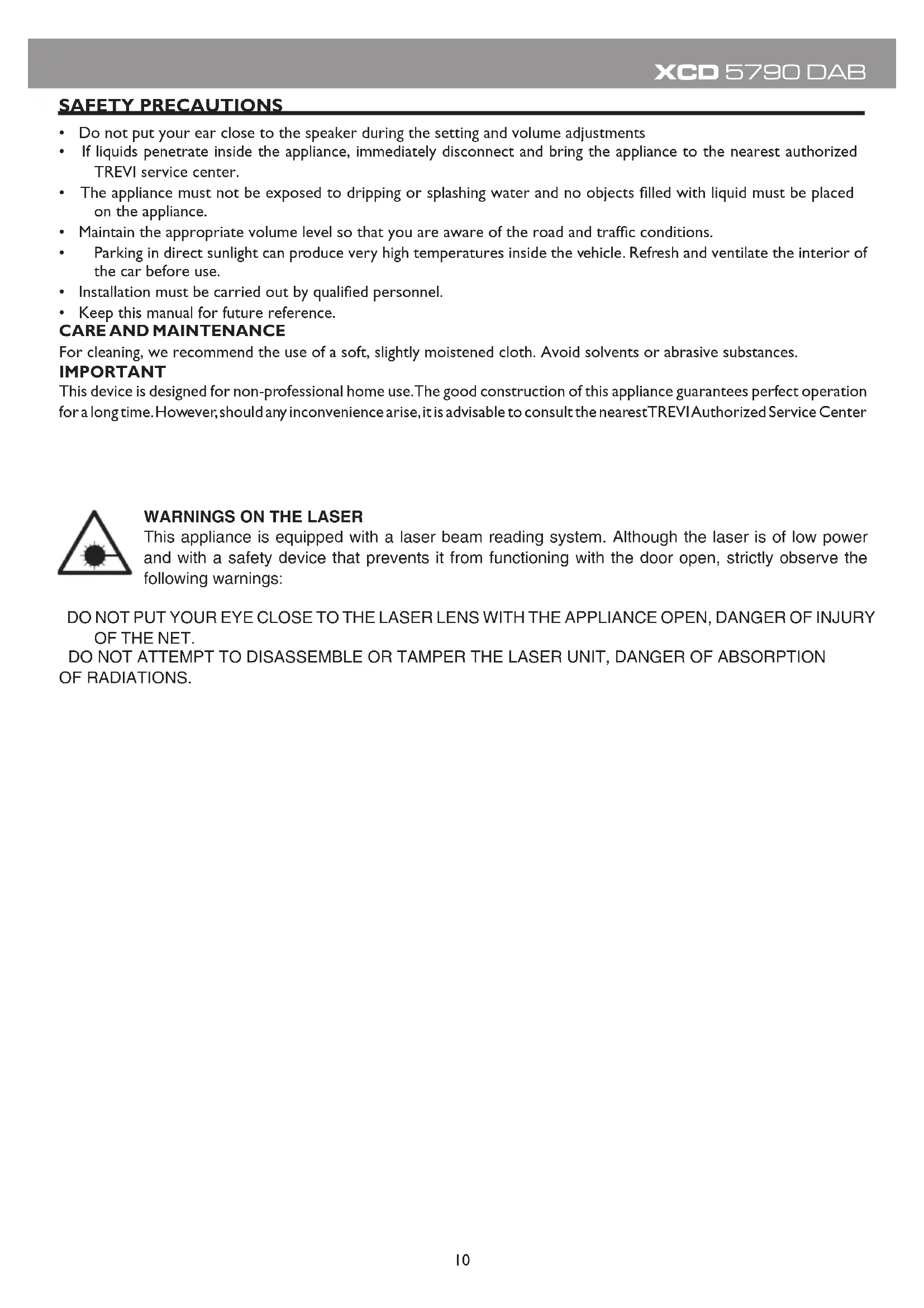 For cleaning, we recommend the use of a soft, slightly moistened cloth. Avoid solvents or abrasive substances. IMPORTANT This device is designed for non-professional home use. The good construction of this appliance guarantees perfect operation for a long time. However, should any inconvenience arise, it is advisable to consult the nearest TREVI Authorized Service Center11 XCD 5790 DAB ENGLISH