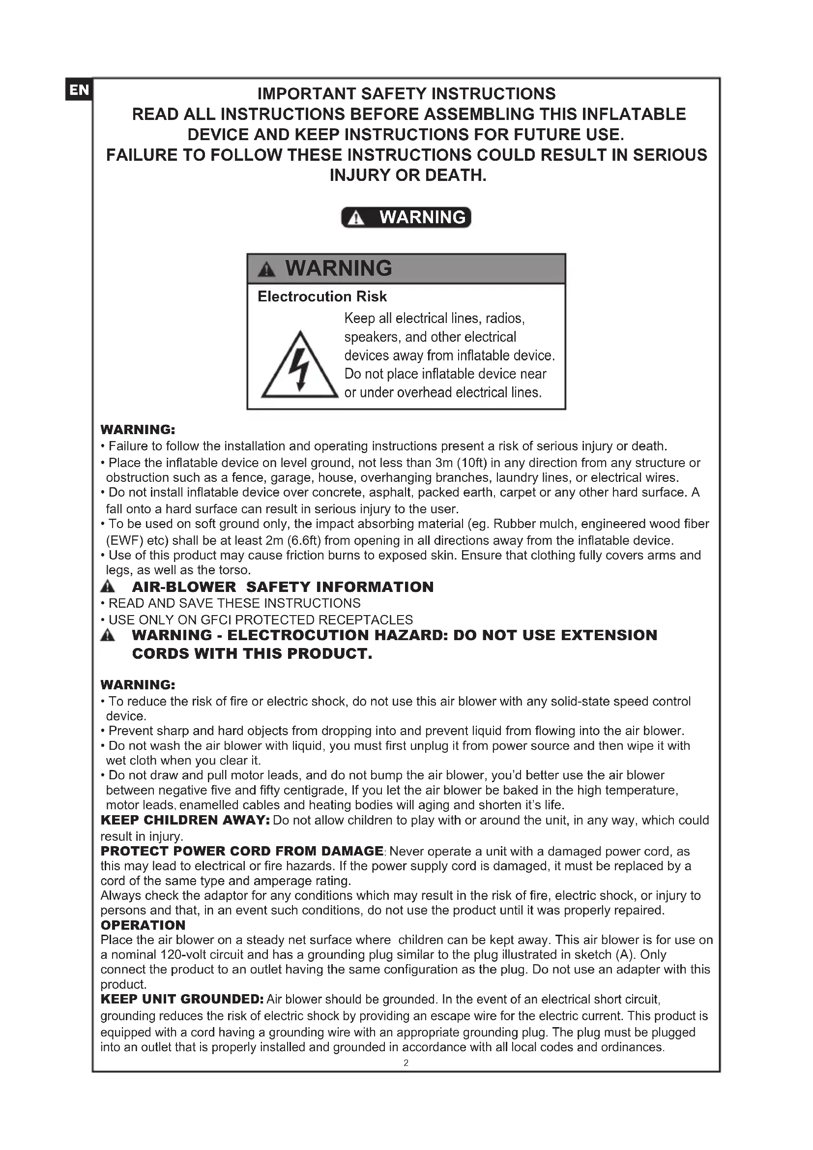 READ ALL INSTRUCTIONS BEFORE ASSEMBLING THIS INFLATABLE DEVICE AND KEEP INSTRUCTIONS FOR FUTURE USE. FAILURE TO FOLLOW THESE INSTRUCTIONS COULD RESULT IN SERIOUS INJURY OR DEATH. WARNING WARNING Electrocution Risk Keep all electrical lines, radios, speakers, and other electrical devices away from inflatable device. Do not place inflatable device near or under overhead electrical lines.