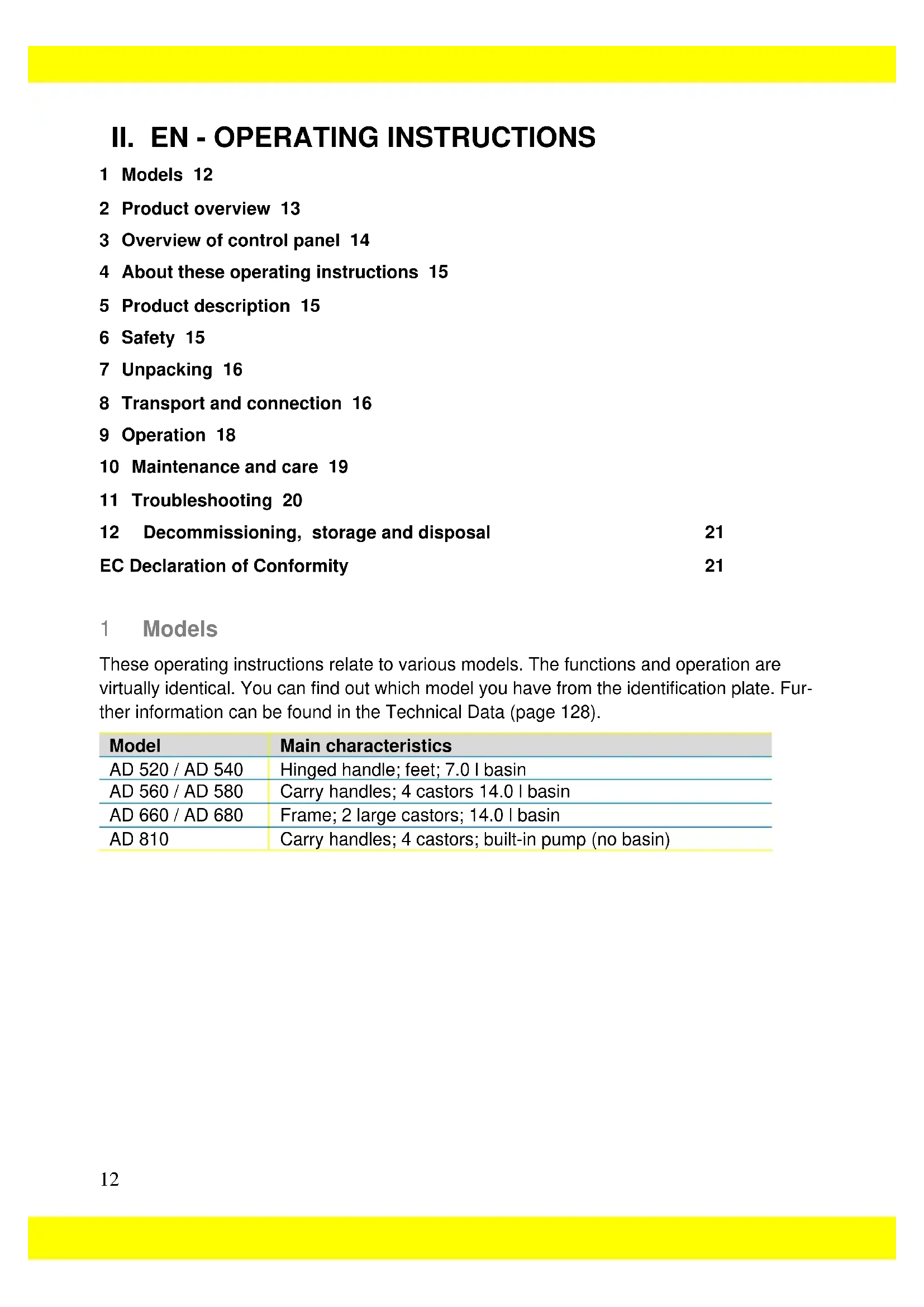 1 Models 12 2 Product overview 13 3 Overview of control panel 14 4 About these operating instructions 15 5 Product description 15 6 Safety 15 7 Unpacking 16 8 Transport and connection 16 9 Operation 18 10 Maintenance and care 19 11 Troubleshooting 20 12 Decommissioning, storage and disposal 21 EC Declaration of Conformity 21 1 Models These operating instructions relate to various models. The functions and operation are virtually identical. You can find out which model you have from the identification plate. Fur- ther information can be found in the Technical Data (page 128). Model Main characteristics AD 520 / AD 540 Hinged handle; feet; 7.0 l basin AD 560 / AD 580 Carry handles; 4 castors 14.0 l basin AD 660 / AD 680 Frame; 2 large castors; 14.0 l basin AD 810 Carry handles; 4 castors; built-in pump (no basin)13 2 Product overview