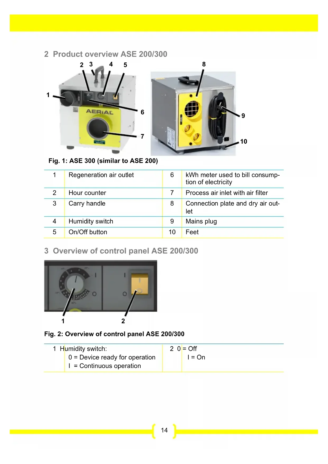 Spare parts and customer service If you have any questions about the ad- sorption-dehumidifier or require spare parts, contact your authorised dealer or AERIAL Service. 13 Troubleshooting Please check the following points in the event of a fault. If necessary contact AERIAL Service. WARNING! Risk of burns, crushing and electrocution! Only allow the manufacturer or au- thorised personnel to carry out re- pairs and maintenance work. In the event of malfunctions, switch off the adsorption-dehumidifier and secure it so that it cannot be switched back on again. Wait at least 15 seconds after switching it off so the rotor can stop turning. Allow any hot components to cool sufficiently before working on them. CAUTION! Mucous membrane irrita- tion! The rotor is coated with a metal silicate; these dust particles may irritate mucous membranes. Wear a protective mask and gog- gles. Observe any information regarding safe handling while taking into con- sideration the safety data sheet and the operating instructions. Faults Problem Possible cause Remedial action The adsorption-dehu- midifier is not per- forming well/removing moisture. Air filter is dirty. The device is not getting enough air. Dirty filters can damage the appliance in the long term. Clean the filter or replace if necessary. The process air inlet is blocked. Check process air inlet and remove any objects in front of it if necessary. The adsorption-dehu- midifier is out of or- der/no fan noises are heard, no air current is perceptible at the dry air outlet or the re- generation air is the same temperature as the dry air. The adsorption-dehumidi- fier is switched off. Switch on the dehumidi- fier. There is no power supply to the adsorption-dehumid- ifier. Check the power supply. ASE 200/300: The desired room humidity has been reached. Once the preset moisture has been exceeded, the adsorption-dehumidifier switches back on auto- matically. Appliance faulty. Contact the manufactu- rer.22 14 Decommissioning, storage and disposal Decommissioning Procedure
