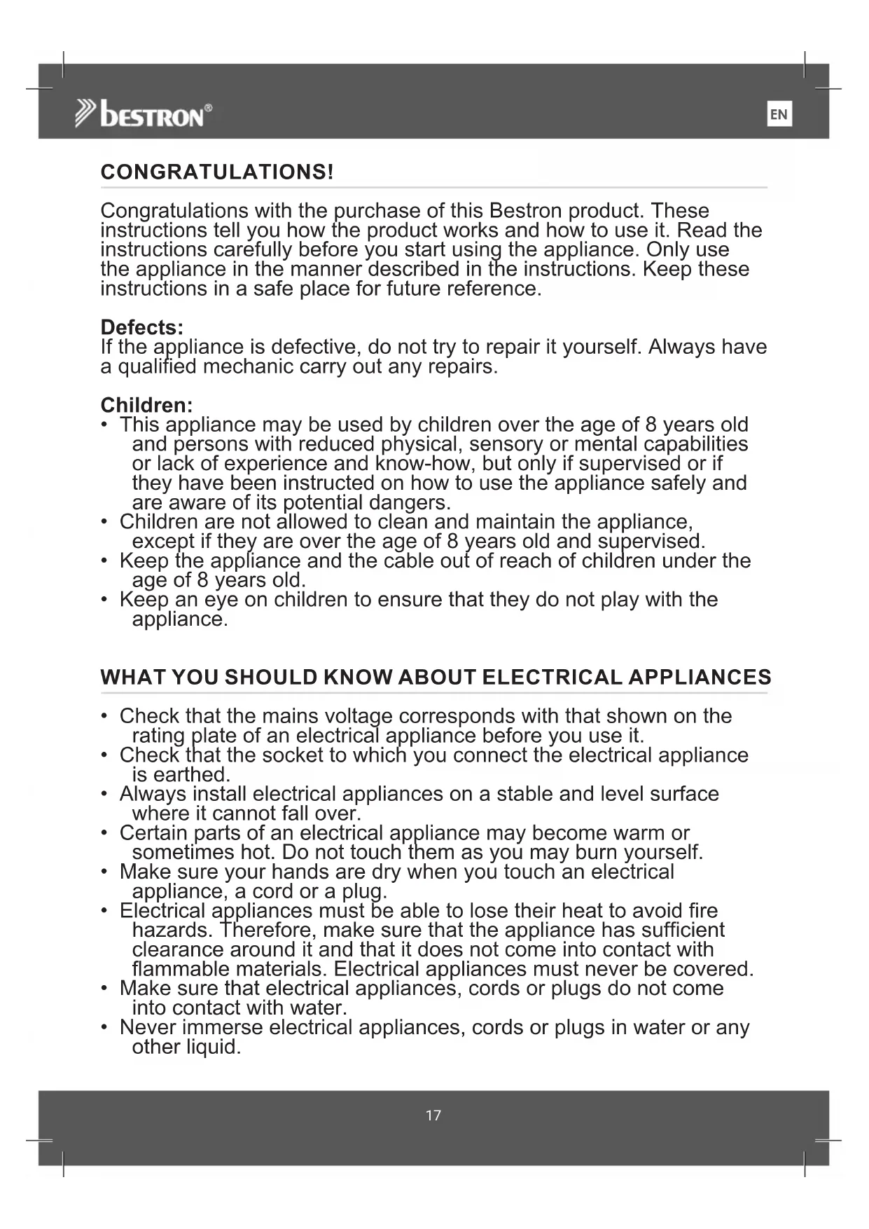 NLCONGRATULATIONS! Congratulations with the purchase of this Bestron product. These instructions tell you how the product works and how to use it. Read the instructions carefully before you start using the appliance. Only use the appliance in the manner described in the instructions. Keep these instructions in a safe place for future reference. Defects: If the appliance is defective, do not try to repair it yourself. Always have a qualified mechanic carry out any repairs. Children: