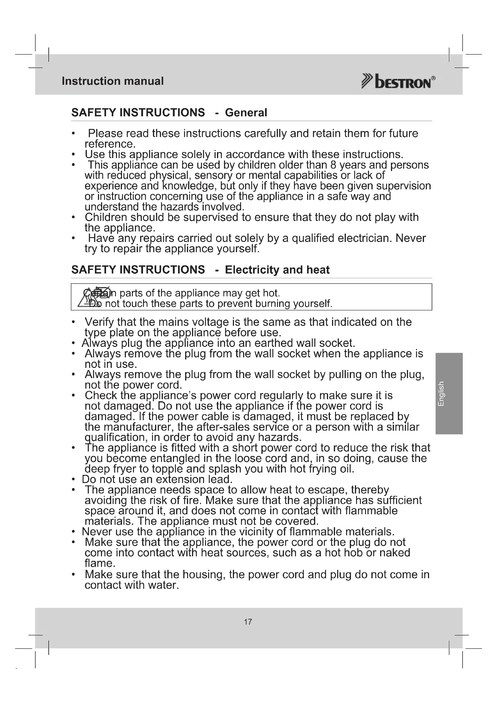 - Have any repairs carried out solely by a qualified electrician. Never try to repair the appliance yourself. SAFETY INSTRUCTIONS - Electricity and heat Certain parts of the appliance may get hot. Do not touch these parts to prevent burning yourself.