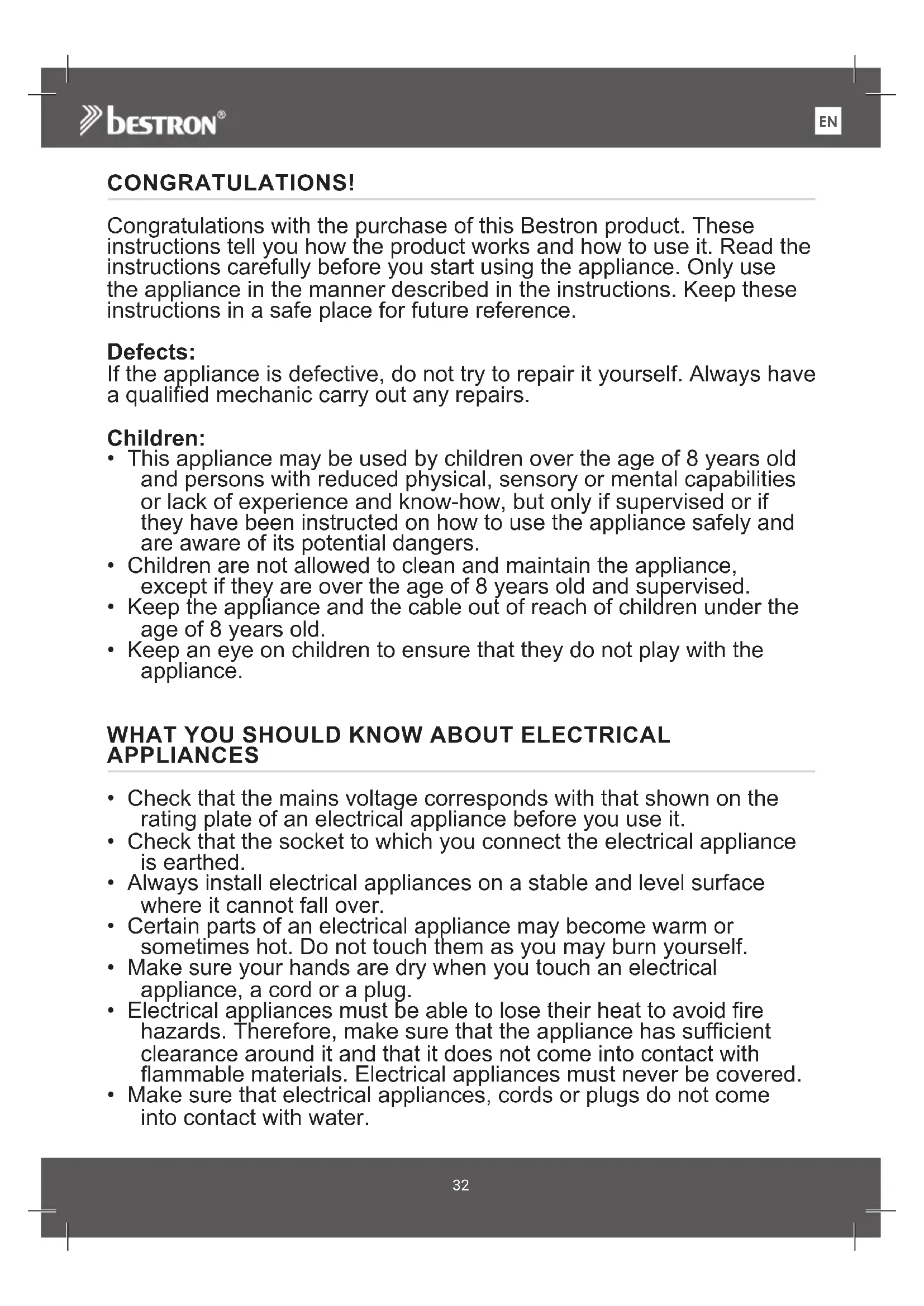 NLCONGRATULATIONS! Congratulations with the purchase of this Bestron product. These instructions tell you how the product works and how to use it. Read the instructions carefully before you start using the appliance. Only use the appliance in the manner described in the instructions. Keep these instructions in a safe place for future reference. Defects: If the appliance is defective, do not try to repair it yourself. Always have a qualified mechanic carry out any repairs. Children: