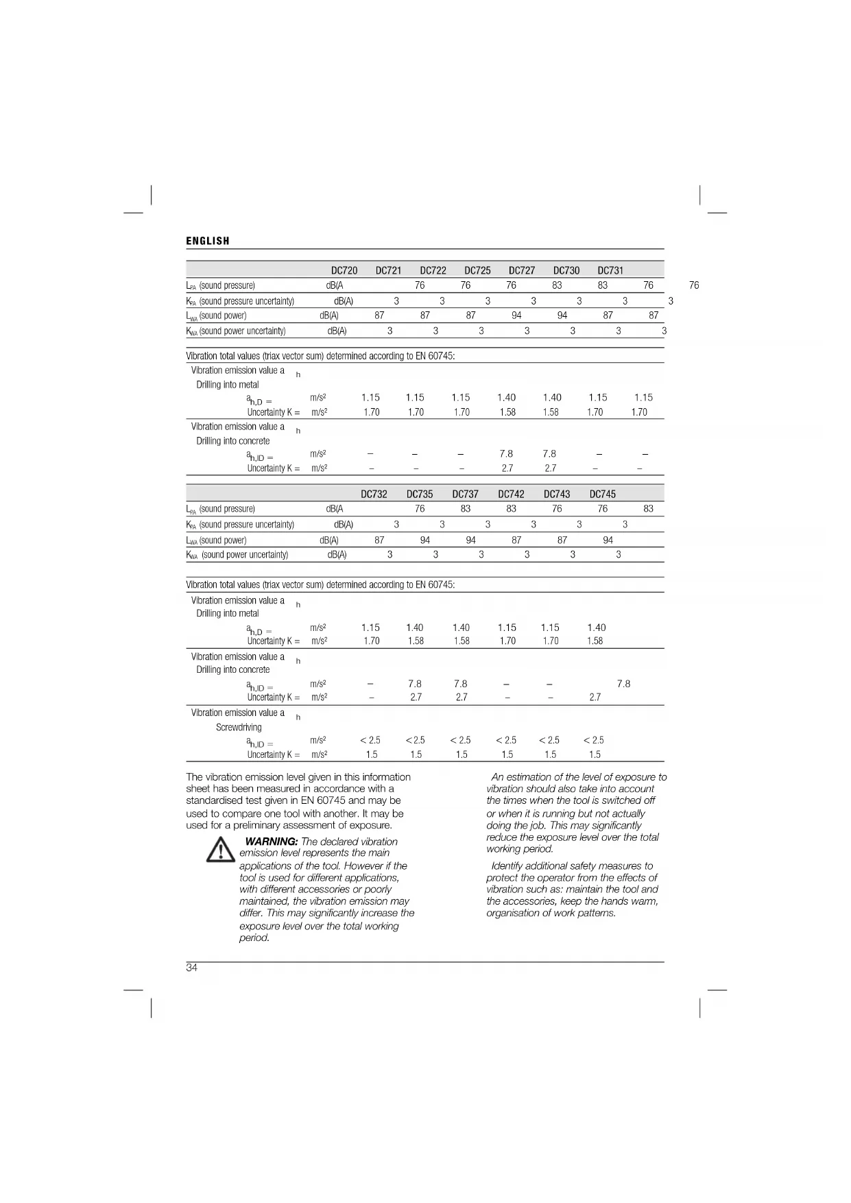 Congratulations! You have chosen a DEWALT tool. Years of experience, thorough product development and innovation make DEWALT one of the most reliable partners for professional power tool users. Technical Data DC720 DC721 DC722 DC725 DC727 DC730 DC731 Voltage V