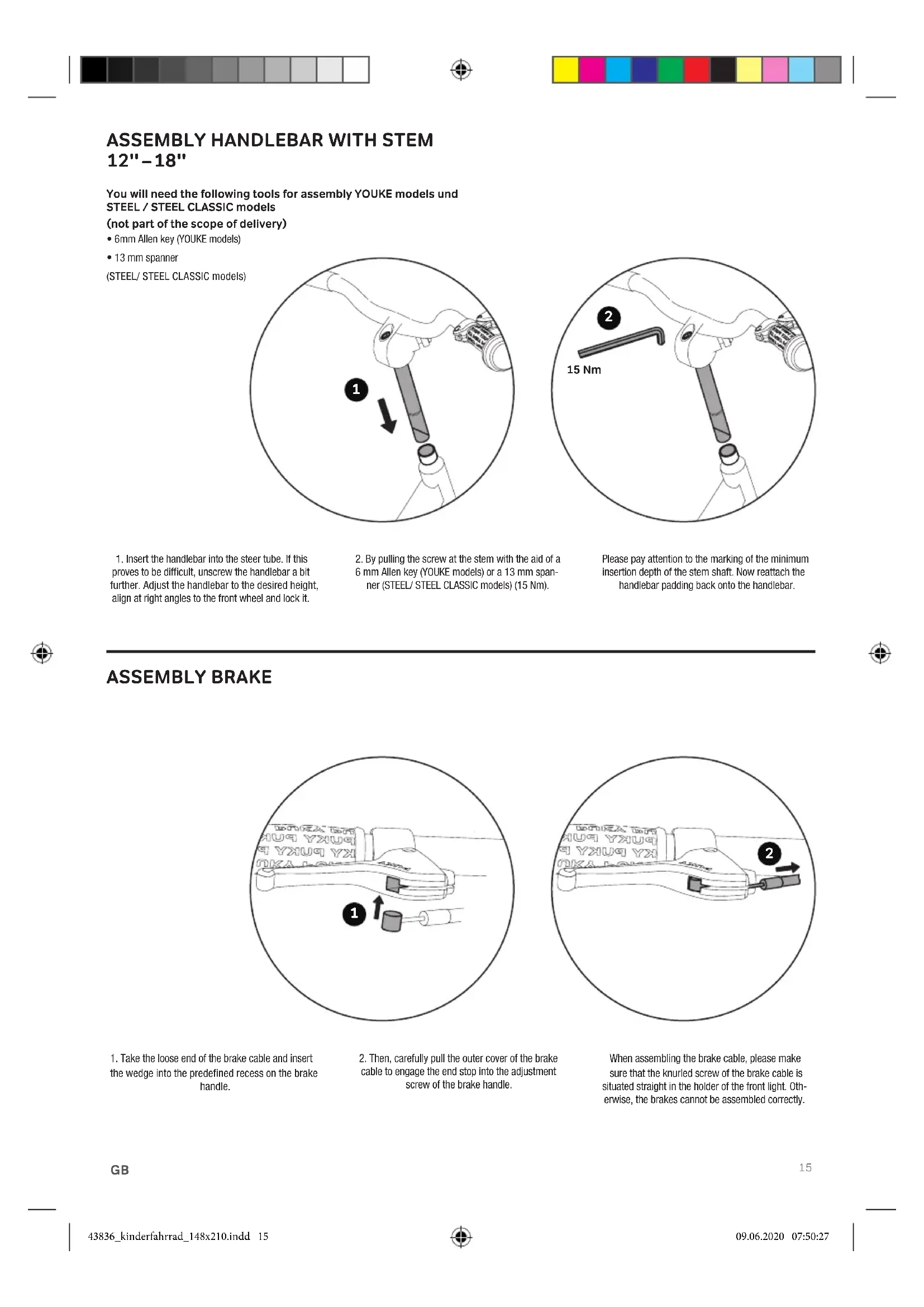 Prepare for use by adjusting to the height of the child. The saddle is to be set so that at least the toes, preferably the ball of the foot, reach the ground in order to ensure balance can be achieved when at a standstill. In doing so, the marking showing the minimum insertion depth on the saddle post into the frame tube must be observed. For more information, see below. The handlebar, hand brake lever and bell must be easy for the child to reach from the set saddle position. In doing so, the marking showing the minimum insertion depth of the handlebar shaft must be observed. After adjusting the handlebar, tighten the clamping screws firmly. Use the following safety checklist to check the bicycle before using. When mounting the pedals, observe the right and left threads (labelled on the pedal axis with an R or L in the vicinity of the thread). The images for the assembly instructions can be found on the last pages of this manual. After assembly, please conduct a safety check in accordance with the safety check- list! During assembly, please note that some parts, such as pedal thread and clamping cone are lubricated. Assembly must be carried out with great caution and by an adult, to avoid any po- tential subsequent accidents or injuries. Please take your time when assembling the bike. In some cases, it is necessary to tighten screws with a prescribed torque. The torque value is stated in Newton metres (e.g. 2 Nm). If the torque with which a screw is tightened is too low, the connection may still be too loose and therefore unsafe. If the torque is too high, screws and other parts may be damaged or destroyed. Please contact your dealer or a workshop if you have any questions. First remove the plastic protective caps from the cap nuts of the front and rear axle as well as from the cantilever brakes at the front. Also remove the plastic foil which has been used to protect the cranks. Remove the handlebar padding from the handlebar and unscrew (with just a few rotations) the underlying screw at the stem with the aid of a 6 mm Allen key (YOUKE models) or a 13 mm spanner (STEEL/ STEEL-CLASSIC models). Now you can remove the plastic cover that protects the clamping cone at the lower end of the stem shaft.