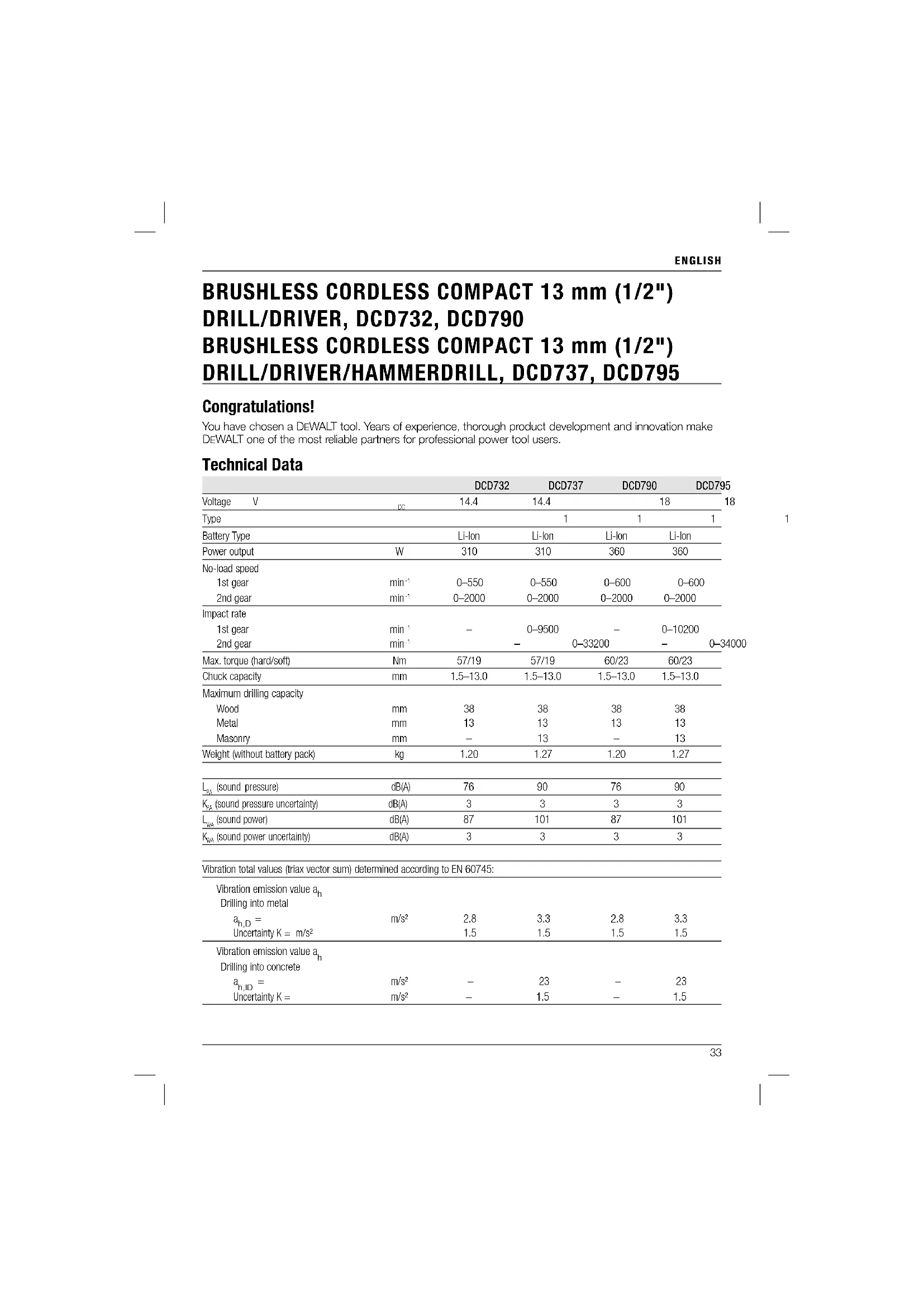 Congratulations! You have chosen a DEWALT tool. Years of experience, thorough product development and innovation make DEWALT one of the most reliable partners for professional power tool users. Technical Data
