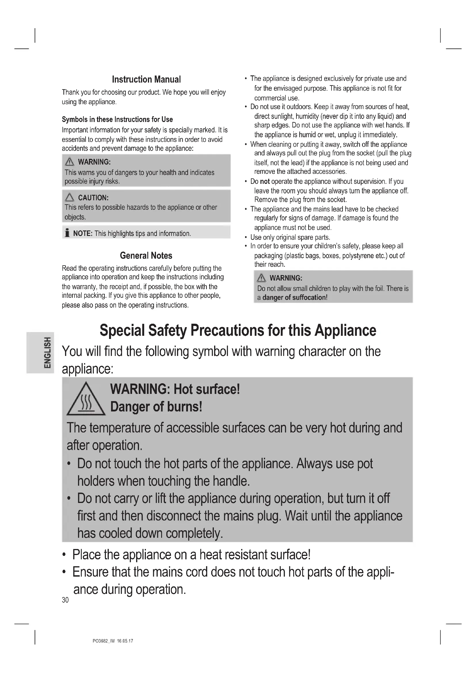 Do not allow small children to play with the foil. There is a danger of suffocation! Special Safety Precautions for this Appliance You will nd the following symbol with warning character on the appliance: