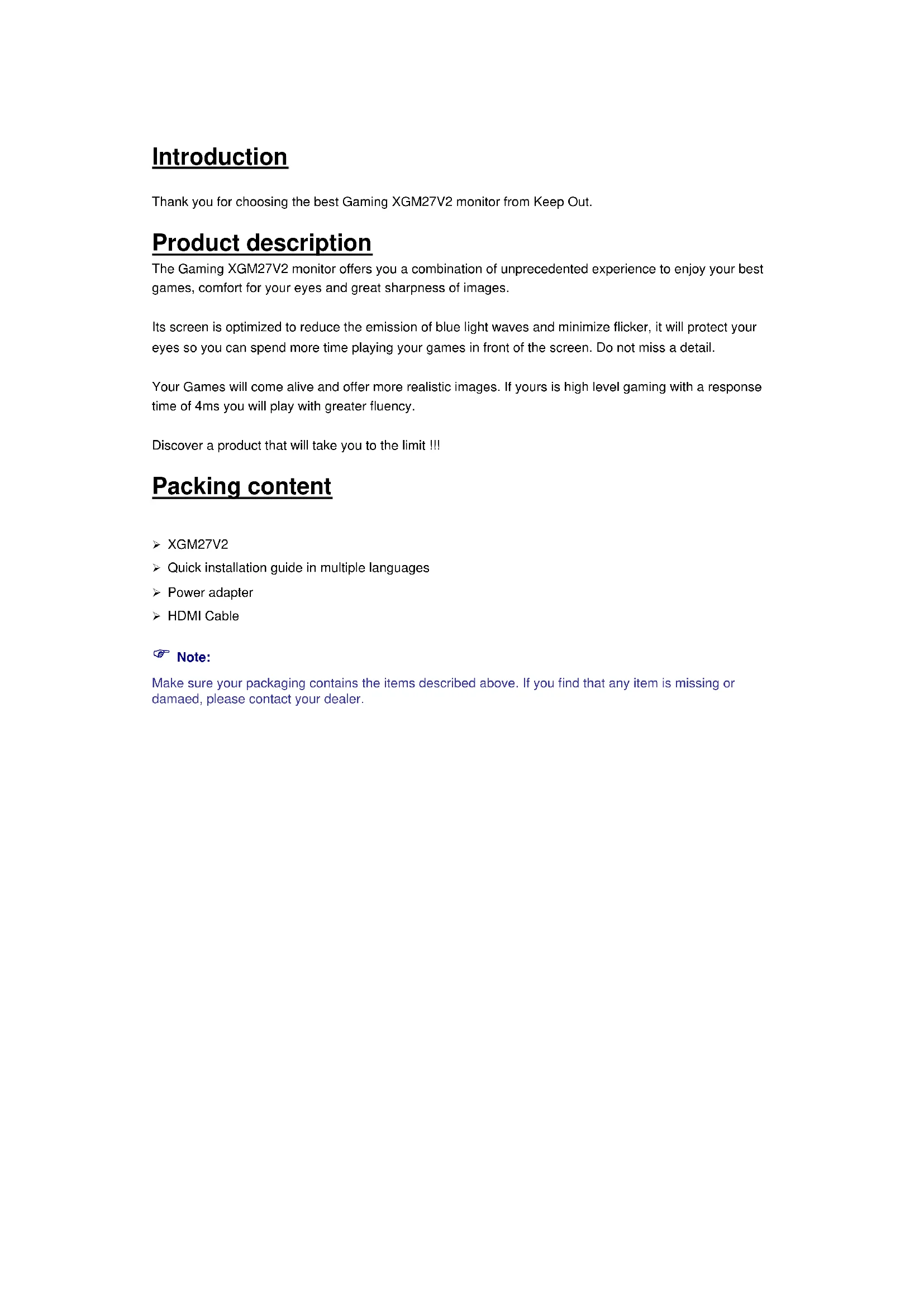 BENUTZERHANDBUCH XGM27v2 MONITORIntroduction Thank you for choosing the best Gaming XGM27V2 monitor from Keep Out. Product description The Gaming XGM27V2 monitor offers you a combination of unprecedented experience to enjoy your best games, comfort for your eyes and great sharpness of images. Its screen is optimized to reduce the emission of blue light waves and minimize flicker, it will protect your eyes so you can spend more time playing your games in front of the screen. Do not miss a detail. Your Games will come alive and offer more realistic images. If yours is high level gaming with a response time of 4ms you will play with greater fluency. Discover a product that will take you to the limit !!! Packing content ➢ XGM27V2 ➢ Quick installation guide in multiple languages ➢ Power adapter ➢ HDMI Cable Note: Make sure your packaging contains the items described above. If you find that any item is missing or damaed, please contact your dealer.Security