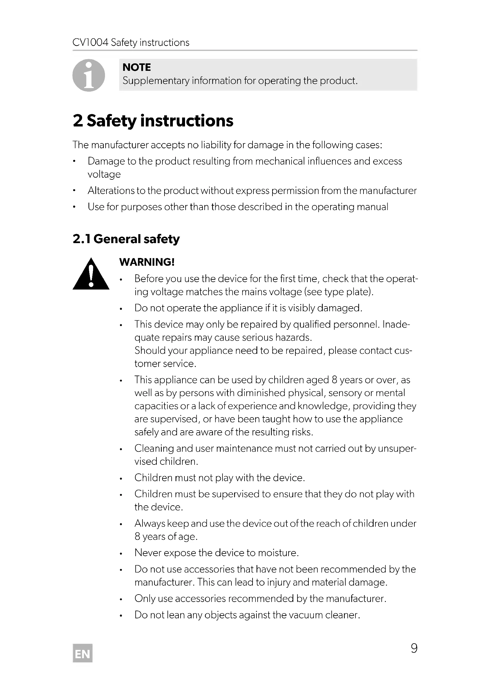 2 Safety instructions The manufacturer accepts no liability for damage in the following cases: