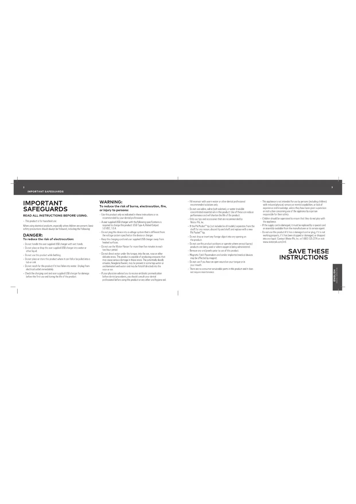- Do not use this product if it has a damaged cord or plug, if it is not working properly, if it has been dropped or damaged, or dropped into any liquid. Contact Water Pik, Inc. at 1-800-525-2774 or visit www.waterpik.com/intl. SAVE THESE INSTRUCTIONSENGLISH