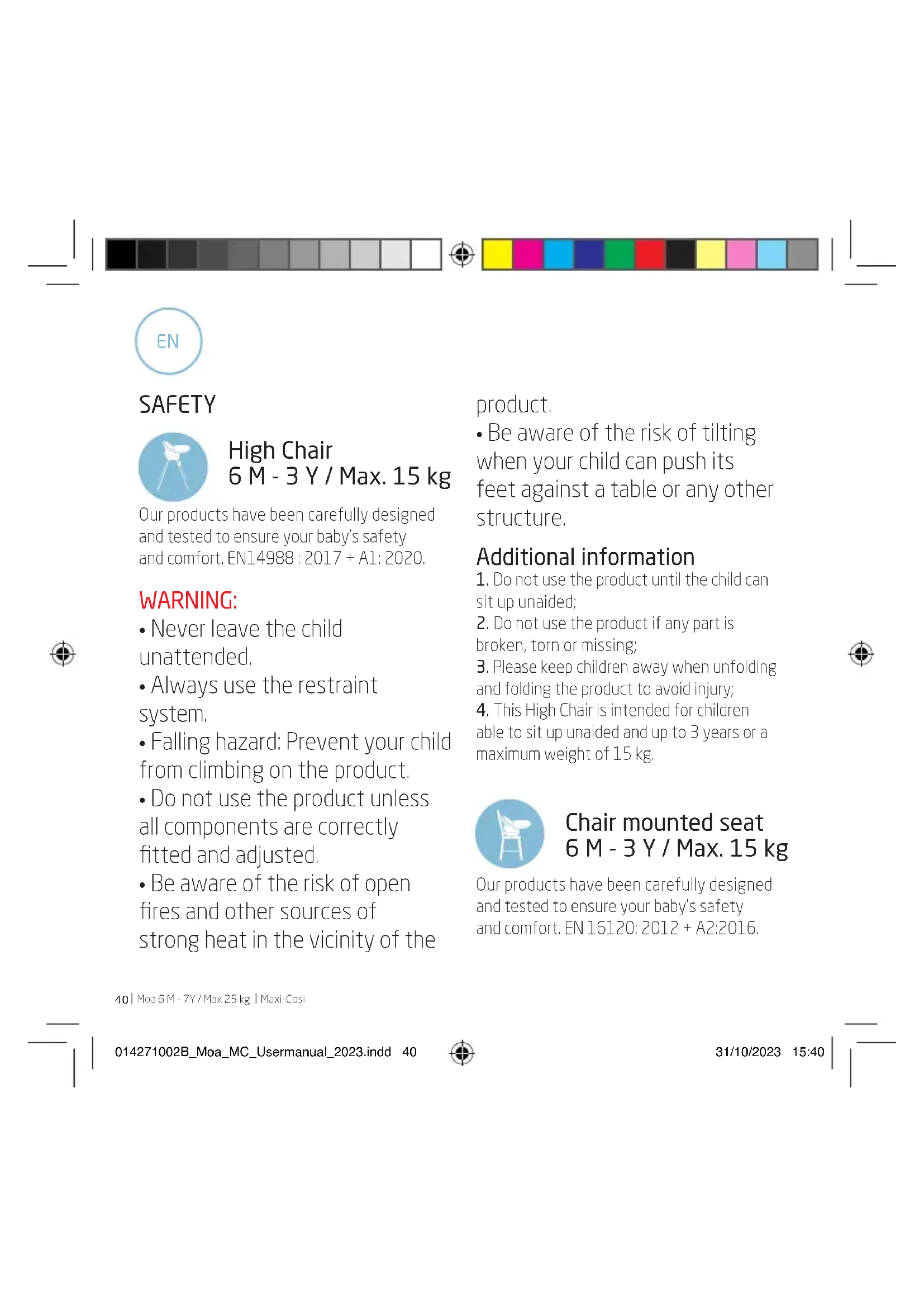 Maxi-Cosi SAFETY High Chair 6 M - 3 Y / Max. 15 kg Our products have been carefully designed and tested to ensure your baby’s safety and comfort. EN14988 : 2017 + A1: 2020.