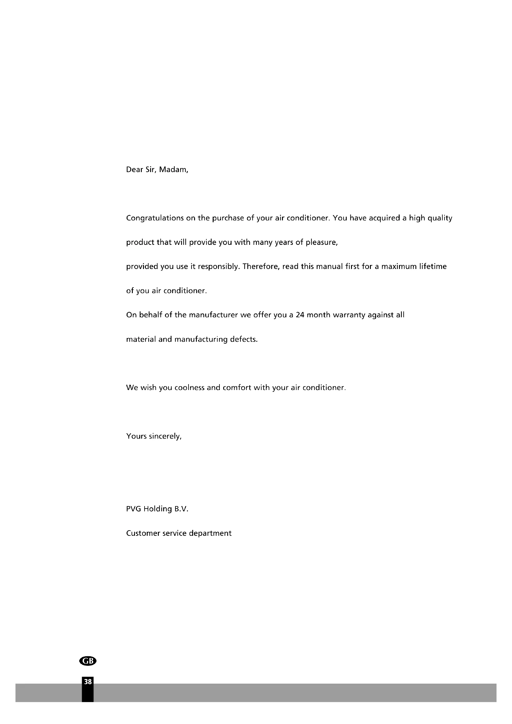 37Dear Sir, Madam, Congratulations on the purchase of your air conditioner. You have acquired a high quality product that will provide you with many years of pleasure, provided you use it responsibly. Therefore, read this manual first for a maximum lifetime of you air conditioner. On behalf of the manufacturer we offer you a 24 month warranty against all material and manufacturing defects. We wish you coolness and comfort with your air conditioner. Yours sincerely, PVG Holding B.V. Customer service department