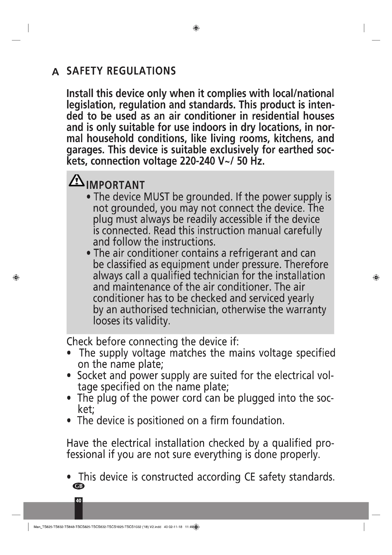 Man_TS825-TS832-TS848-TSCS825-TSCS832-TSCS1025-TSCS1032 ('18) V2.indd 39 02-11-18 11:49A SAFETY REGULATIONS Install this device only when it complies with local/national legislation, regulation and standards. This product is inten- ded to be used as an air conditioner in residential houses and is only suitable for use indoors in dry locations, in nor- mal household conditions, like living rooms, kitchens, and garages. This device is suitable exclusively for earthed soc- kets, connection voltage 220-240 V~/ 50 Hz. IMPORTANT