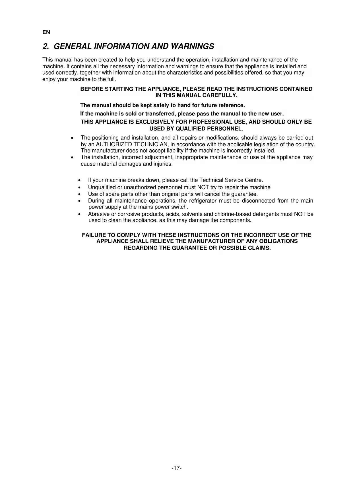 - The positioning and installation, and all repairs or modifications, should always be carried out by an AUTHORIZED TECHNICIAN, in accordance with the applicable legislation of the country. The manufacturer does not accept liability if the machine is incorrectly installed.