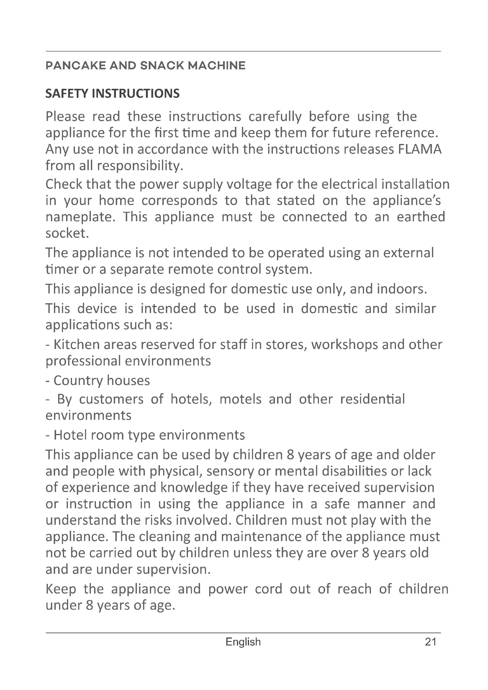 SAFETY INSTRUCTIONS Please read these instrucons carefully before using the appliance for the rst me and keep them for future reference. Any use not in accordance with the instrucons releases FLAMA from all responsibility. Check that the power supply voltage for the electrical installaon in your home corresponds to that stated on the appliance’s nameplate. This appliance must be connected to an earthed socket. The appliance is not intended to be operated using an external mer or a separate remote control system. This appliance is designed for domesc use only, and indoors. This device is intended to be used in domesc and similar applicaons such as: - Kitchen areas reserved for sta in stores, workshops and other professional environments - Country houses - By customers of hotels, motels and other residenal environments - Hotel room type environments This appliance can be used by children 8 years of age and older and people with physical, sensory or mental disabilies or lack of experience and knowledge if they have received supervision or instrucon in using the appliance in a safe manner and understand the risks involved. Children must not play with the appliance. The cleaning and maintenance of the appliance must not be carried out by children unless they are over 8 years old and are under supervision. Keep the appliance and power cord out of reach of children under 8 years of age.22 www.ama.pt Warning - The temperature of accessible surfaces may be high when the appliance is in operaon. Disconnect the appliance from the power supply by removing the plug from the socket aer each use and when cleaning. Allow it to cool down before carrying out any cleaning or storage operaon. Before connecng the appliance, make sure you place it on a at, stable and horizontal surface. Do not use the appliance if the power cord or plug is damaged, have them replaced immediately by an authorized FLAMA Technical Assistance Service. If the power cord is damaged, it must be replaced by the manufacturer, its aer-sales service or similarly qualied personnel in order to avoid a hazard. The appliance must never be used near ammable or combusble materials. Never leave the device unaended. Do not cover the appliance while it is in operaon. Do not disassemble the device. The appliance must only be used for cooking food. Its use for other purposes may cause irreparable damage. Never immerse the device in water or any other liquid.