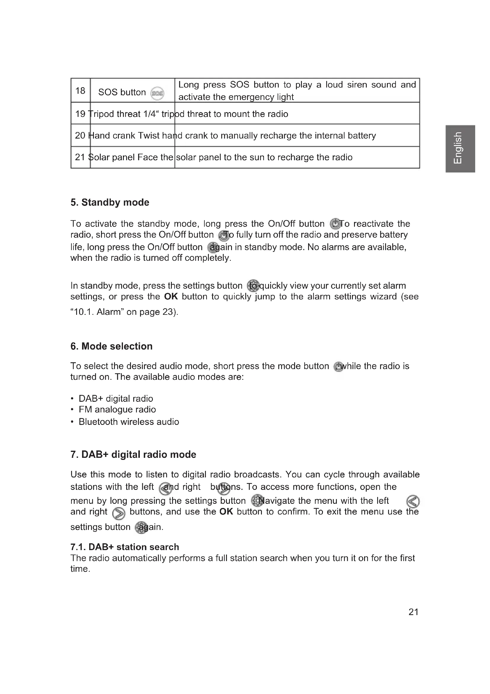 SOS button Long press SOS button to play a loud siren sound and activate the emergency light 19 Tripod threat 1/4“ tripod threat to mount the radio 20 Hand crank Twist hand crank to manually recharge the internal battery 21 Solar panel Face the solar panel to the sun to recharge the radio
