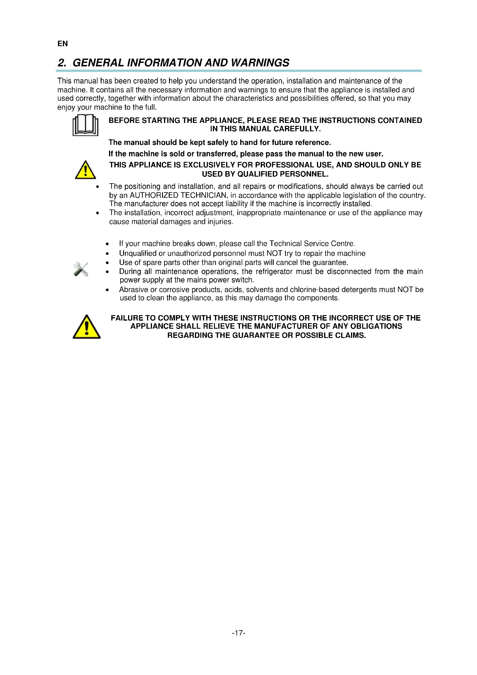 - The positioning and installation, and all repairs or modifications, should always be carried out by an AUTHORIZED TECHNICIAN, in accordance with the applicable legislation of the country. The manufacturer does not accept liability if the machine is incorrectly installed.