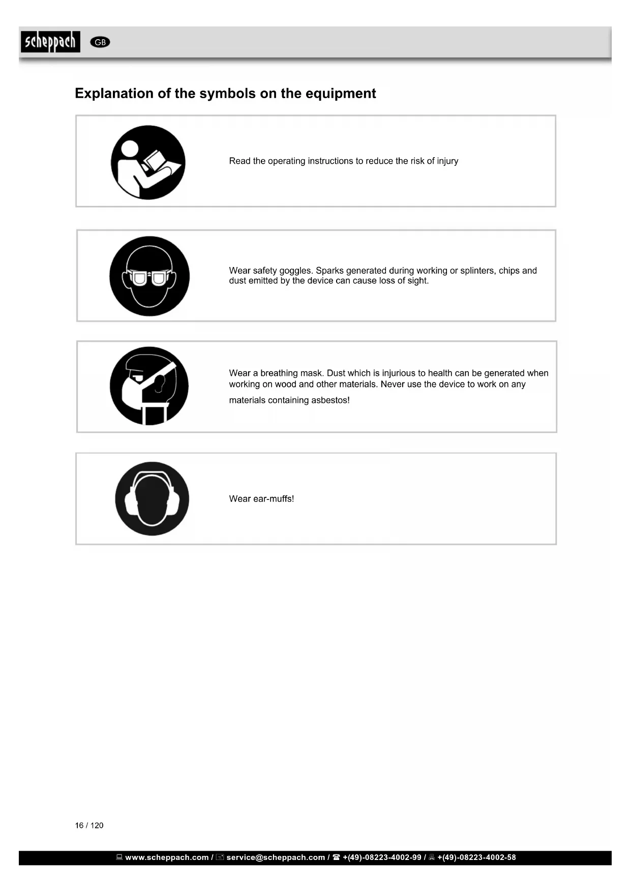 - Only use original scheppach parts for accessories as well as for wearing and spare parts. Spare parts are available from your specialized dealer.