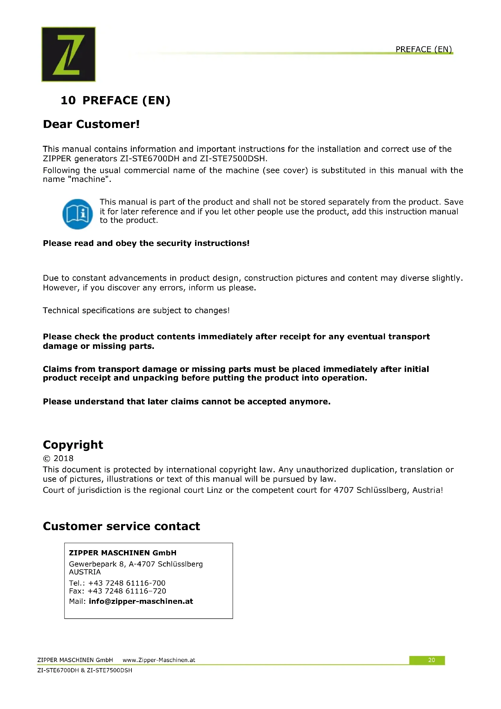 10 PREFACE (EN) Dear Customer! This manual contains information and important instructions for the installation and correct use of the ZIPPER generators ZI-STE6700DH and ZI-STE7500DSH. Following the usual commercial name of the machine (see cover) is substituted in this manual with the name "machine". This manual is part of the product and shall not be stored separately from the product. Save it for later reference and if you let other people use the product, add this instruction manual to the product. Please read and obey the security instructions!