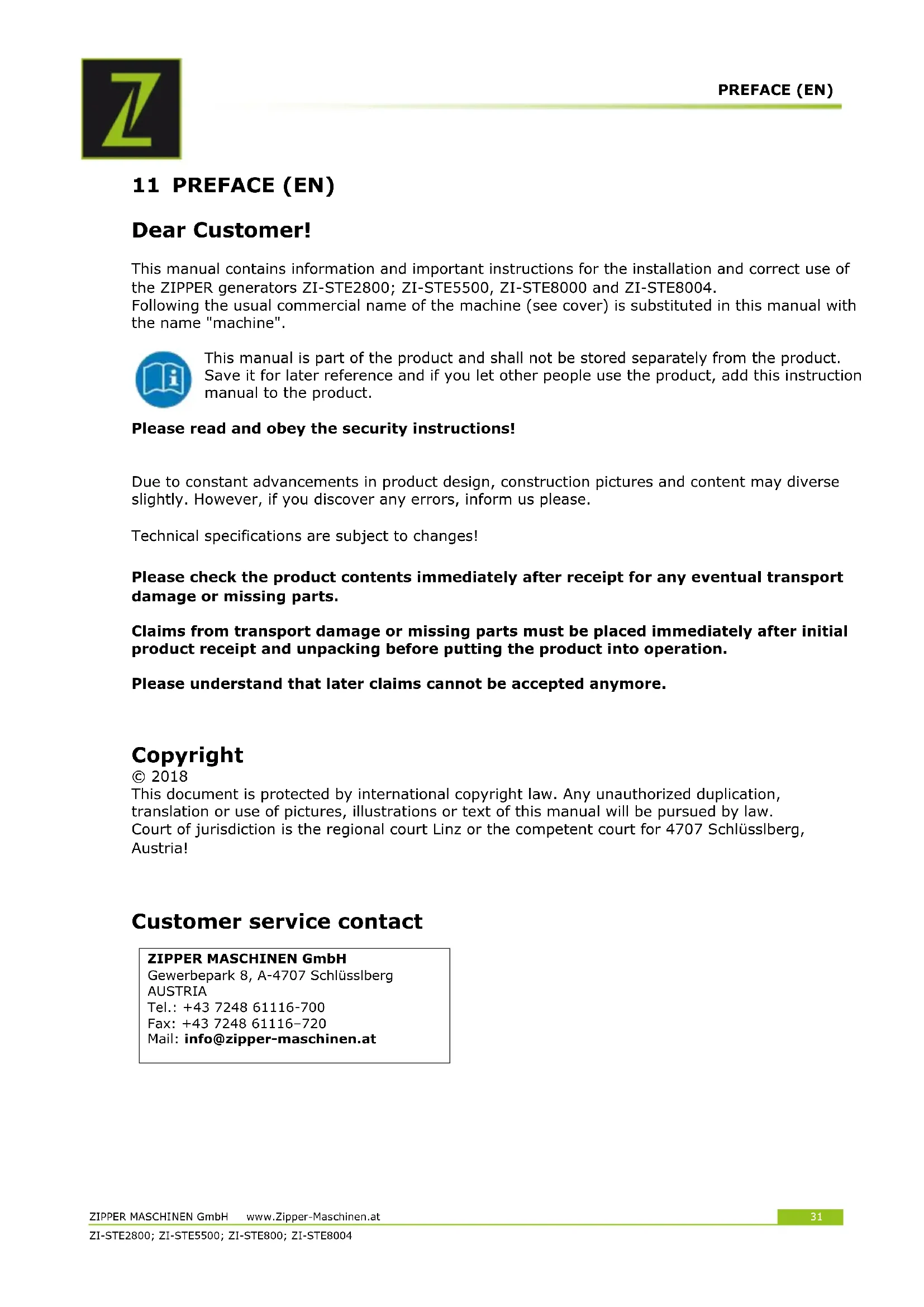 11 PREFACE (EN) Dear Customer! This manual contains information and important instructions for the installation and correct use of the ZIPPER generators ZI-STE2800; ZI-STE5500, ZI-STE8000 and ZI-STE8004. Following the usual commercial name of the machine (see cover) is substituted in this manual with the name "machine". This manual is part of the product and shall not be stored separately from the product. Save it for later reference and if you let other people use the product, add this instruction manual to the product. Please read and obey the security instructions!