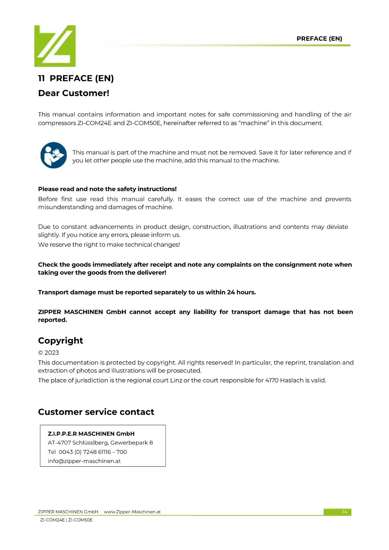 11 PREFACE (EN) Dear Customer! This manual contains information and important notes for safe commissioning and handling of the air compressors ZI-COM24E and ZI-COM50E, hereinafter referred to as “machine” in this document.