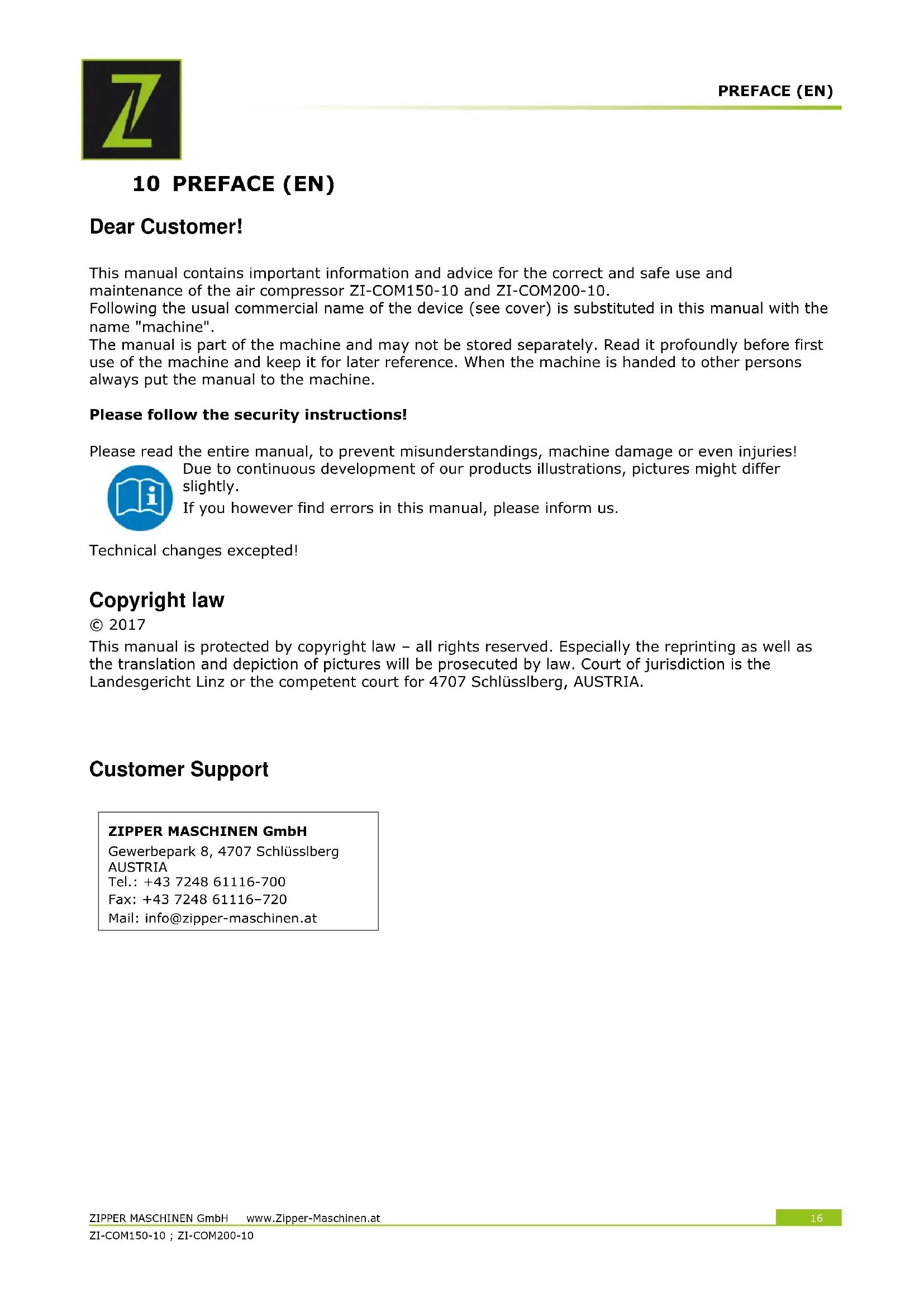 10 PREFACE (EN) Dear Customer! This manual contains important information and advice for the correct and safe use and maintenance of the air compressor ZI-COM150-10 and ZI-COM200-10. Following the usual commercial name of the device (see cover) is substituted in this manual with the name "machine". The manual is part of the machine and may not be stored separately. Read it profoundly before first use of the machine and keep it for later reference. When the machine is handed to other persons always put the manual to the machine. Please follow the security instructions! Please read the entire manual, to prevent misunderstandings, machine damage or even injuries! Due to continuous development of our products illustrations, pictures might differ slightly. If you however find errors in this manual, please inform us. Technical changes excepted! Copyright law © 2017 This manual is protected by copyright law – all rights reserved. Especially the reprinting as well as the translation and depiction of pictures will be prosecuted by law. Court of jurisdiction is the Landesgericht Linz or the competent court for 4707 Schlüsslberg, AUSTRIA.