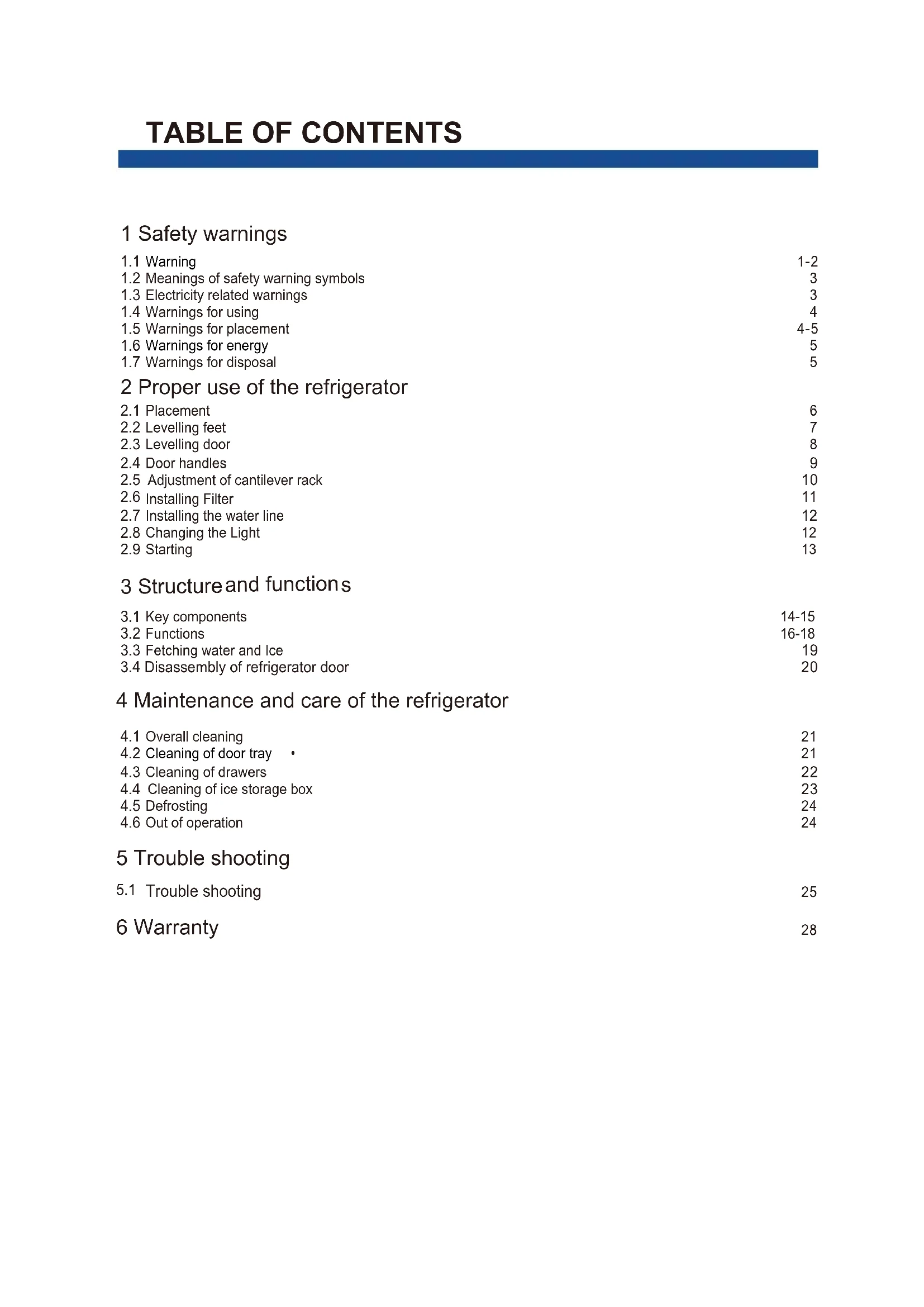 1 Safety warnings 2 Proper use of the refrigerator 3 Structure and function