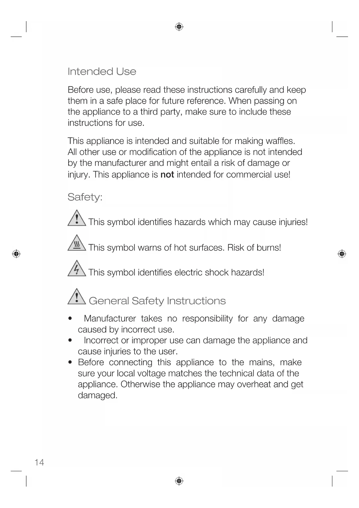 - Before connecting this appliance to the mains, make sure your local voltage matches the technical data of the appliance. Otherwise the appliance may overheat and get damaged.Instruction Manual ENGLISH