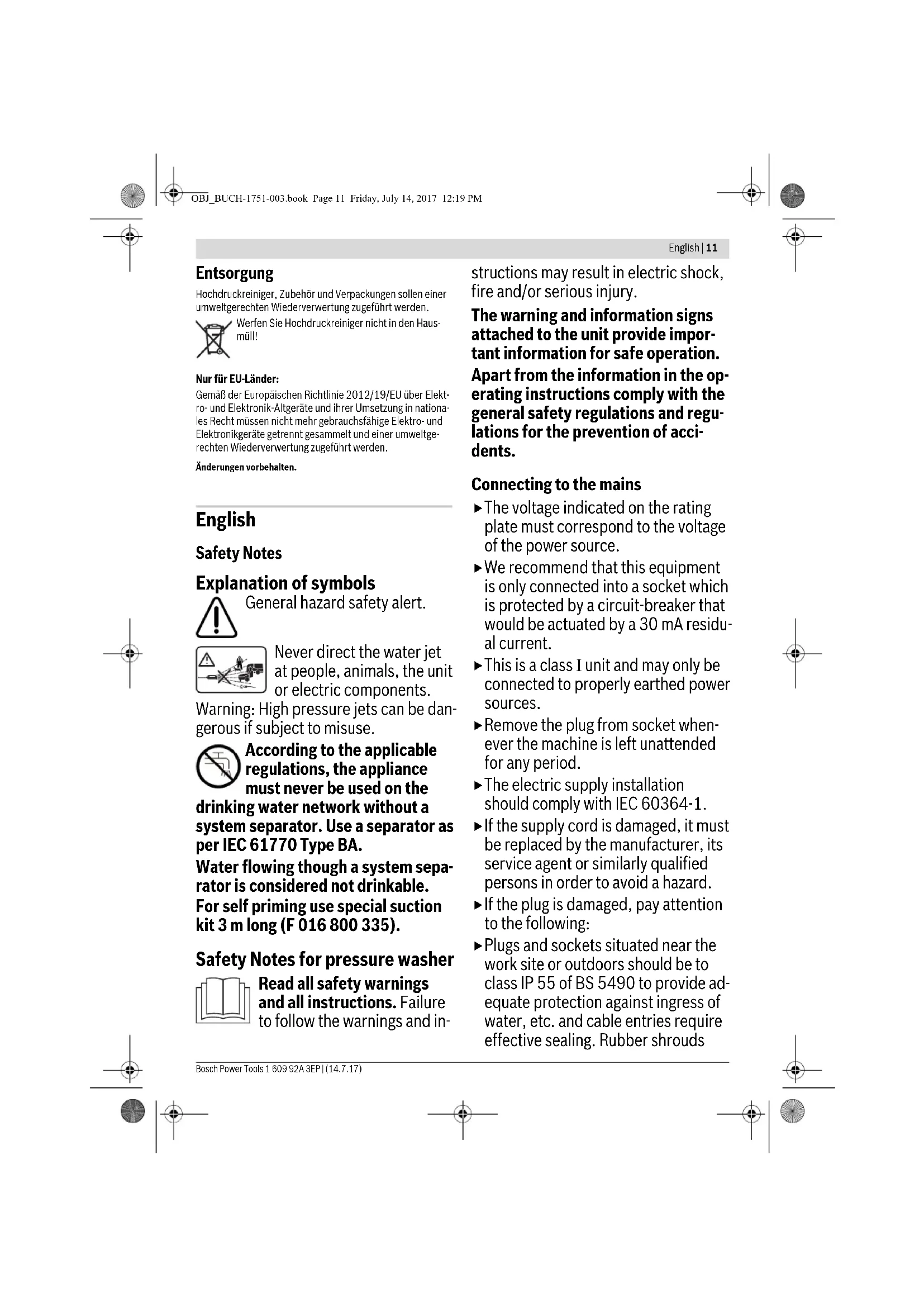 gerous if subject to misuse. According to the applicable regulations, the appliance must never be used on the drinking water network without a system separator. Use a separator as per IEC 61770 Type BA. Water flowing though a system sepa- rator is considered not drinkable. For self priming use special suction kit 3 m long (F 016 800 335). Safety Notes for pressure washer Read all safety warnings and all instructions. Failure to follow the warnings and in- structions may result in electric shock, fire and/or serious injury. The warning and information signs attached to the unit provide impor- tant information for safe operation. Apart from the information in the op- erating instructions comply with the general safety regulations and regu- lations for the prevention of acci- dents. Connecting to the mains The voltage indicated on the rating plate must correspond to the voltage of the power source. We recommend that this equipment is only connected into a socket which is protected by a circuit-breaker that would be actuated by a 30 mA residu- al current. This is a class I unit and may only be connected to properly earthed power sources. Remove the plug from socket when- ever the machine is left unattended for any period. The electric supply installation should comply with IEC 60364-1. If the supply cord is damaged, it must be replaced by the manufacturer, its service agent or similarly qualified persons in order to avoid a hazard. If the plug is damaged, pay attention to the following: Plugs and sockets situated near the work site or outdoors should be to class IP 55 of BS 5490 to provide ad- equate protection against ingress of water, etc. and cable entries require effective sealing. Rubber shrouds OBJ_BUCH-1751-003.book Page 11 Friday, July 14, 2017 12:19 PM12 | English 1 609 92A 3EP | (14.7.17) Bosch Power Tools should be provided over cable glands. Drip-proof (class IP X2 of BS 5490) plugs and sockets to BS 4343 are suitable for use indoors where the plug is away from the water spray area where the appliance is in use. Never touch the mains plug with wet hands. Do not pull plug while operating the device. Do not run over, crush or pull the power supply cord or extension cord, otherwise it may be damaged. Pro- tect the cable from heat, oil and sharp edges. Do not use the unit, if the power sup- ply cord or important parts, e. g. high-pressure hose, power gun or safety devices are damaged.
