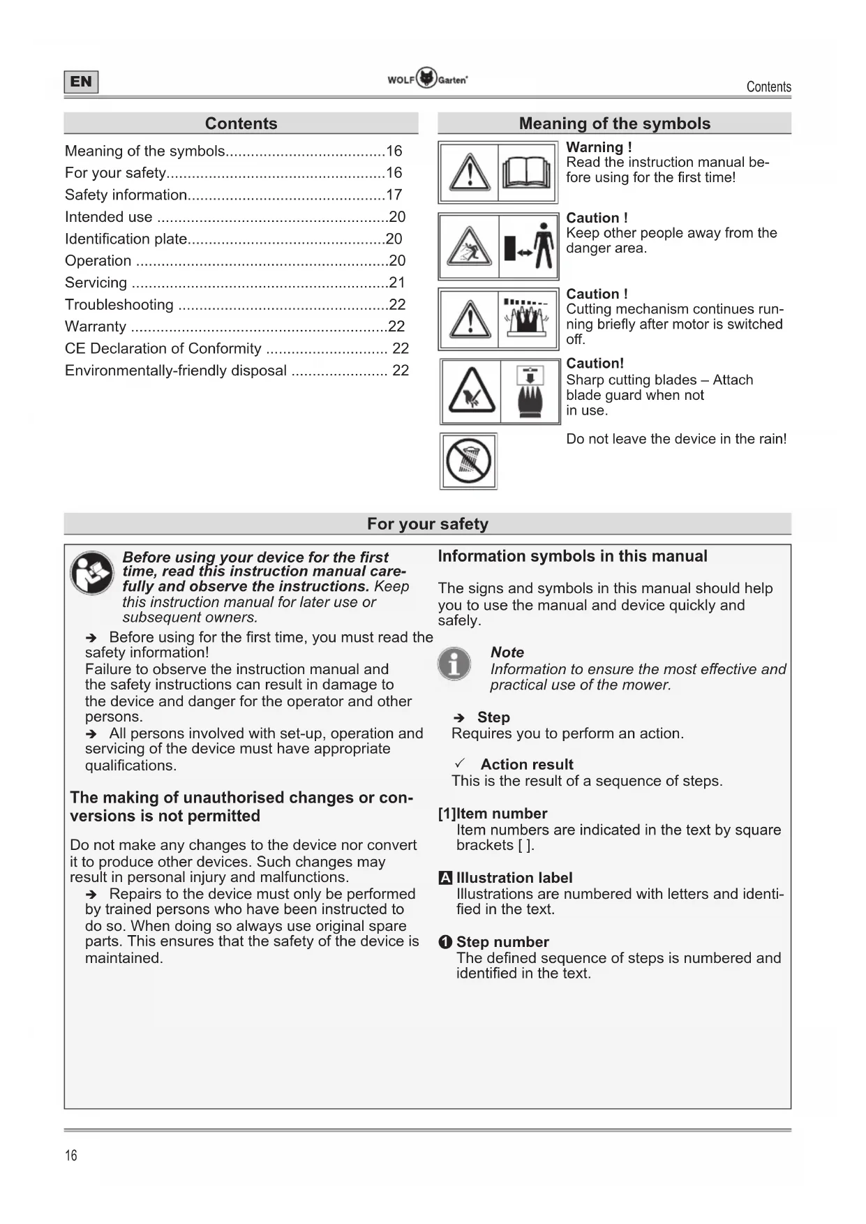 Safety information Danger levels of warning information The following danger levels are used in this instruc- tion manual to indicate potentially dangerous situations: DANGER ! A dangerous situation is highly likely and, if the measures are not followed, will result in severe injury and even death. WARNING ! A dangerous situation may occur and, if the measures are not followed, will result in severe injury and even death. CAUTION ! A dangerous situation may occur and, if the measures are not followed, will result in slight or minor injuries. Attention ! A possibly harmful situation may occur which if not avoided will result in property damage. Safety information content DANGER ! Type and source of the danger! ÂConsequences of non-observation ¾ Measure for preventing the danger Workplace safety ¾ Keep your work area clean and well lit. Messy and poorly lit work areas can lead to accidents. ¾ Do not use the power tool in an explosive environment, where there are inammable liquids, gases or dusts. Electrical power tools may create sparks, which could ignite the dust or vapours. ¾ Keep children and other persons away from the power tool during use. You can lose control of the device when distracted. Electrical safety ¾ Pull the mains plug immediately if the cable is damaged or severed. ¾ The connector plug of the power tool must t inside the socket. Under no circumstances may the plug be modied. Do not use any adapter plugs together with grounded power tools. Unmodied plugs and matching sockets reduce the risk of an electric shock. ¾ Avoid body contact with earthed surfaces such as of pipes, heaters, cookers and refrigerators. There is an increased risk of electric shock when your body is earthed. ¾ Keep power tools away from rain and water. The ingress of water into an electric power tool increases the risk of an electric shock. ¾ Do not misuse the cable by using it to carry or hang up the power tool or to pull the plug from the socket. Keep the cable away from heat, oil, sharp edges and moving device components. Damaged or tangled cable increases the risk of an electric shock. ¾ Only charge Wolf-Garten power packs. The power pack voltage must match the power pack charging voltage of the charger. Otherwise there is a risk of re and explosion. ¾ Keep the device clean. Dirt increases the risk of an electric shock. Personal safety ¾ The device may not be used by persons with limited physical, sensory or mental abilities or lack of experience and / or knowledge, even if they are supervised or have received instructions about the safe handling of the device and understand the associated dangers. ¾ Children are not allowed to play with the mower. ¾ Cleaning and servicing may not be carried out by children. ¾ Do not use the device with defective or detached safety equipment.Safety information