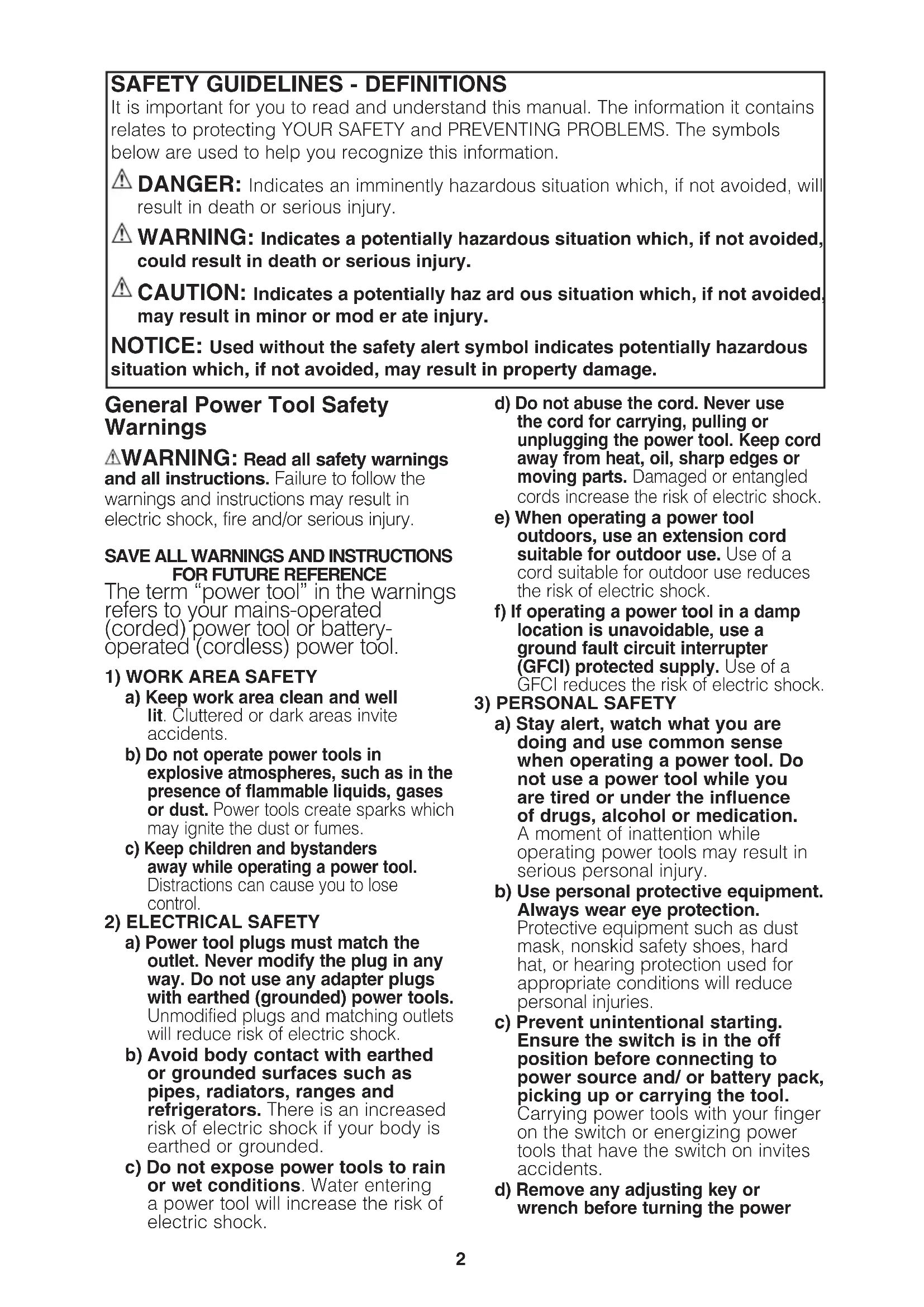 Use of this tool can generate and/or disperse dust, which may cause serious and permanent respiratory or other injury. Always use NOSH/OSHA approved respiratory protection appropriate for the dust exposure. Direct particles away from face and body. SYMBOLS The label on your tool may include the following symbols. The symbols and their definitions are as follows: V .................. volts A ..................amperes Hz ................hertz W ................. watts min ..............minutes or AC ......alternating current or DC ...direct current