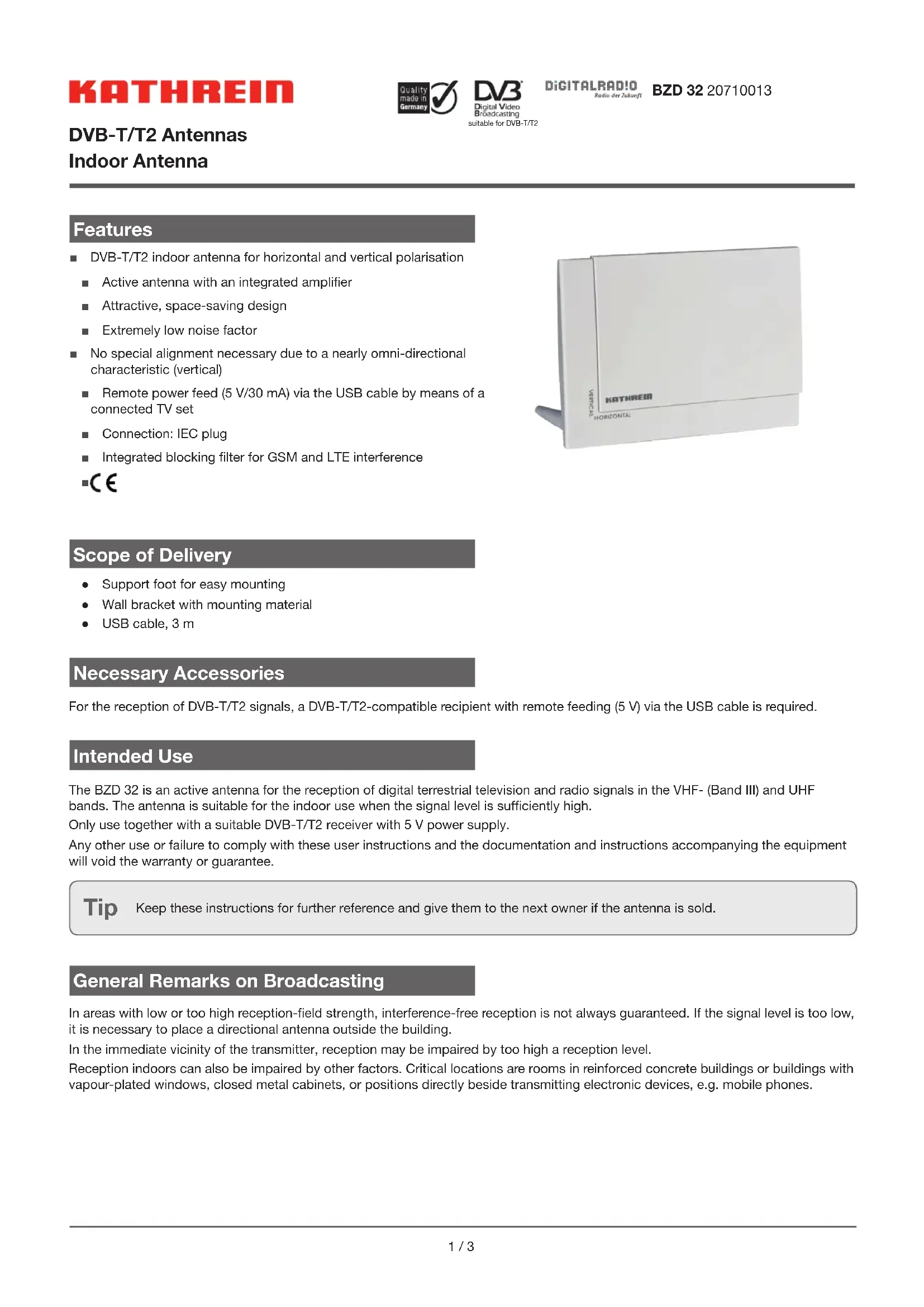 Scope of Delivery ● Support foot for easy mounting ● Wall bracket with mounting material ● USB cable, 3m Necessary Accessories For the reception of DVB-T/T2 signals, a DVB-T/T2-compatible recipient with remote feeding (5V) via the USB cable is required. Intended Use The BZD32 is an active antenna for the reception of digital terrestrial television and radio signals in the VHF- (Band III) and UHF bands. The antenna is suitable for the indoor use when the signal level is sufficiently high. Only use together with a suitable DVB-T/T2 receiver with 5V power supply. Any other use or failure to comply with these user instructions and the documentation and instructions accompanying the equipment will void the warranty or guarantee. Tip Keep these instructions for further reference and give them to the next owner if the antenna is sold. General Remarks on Broadcasting In areas with low or too high reception-field strength, interference-free reception is not always guaranteed. If the signal level is too low, it is necessary to place a directional antenna outside the building. In the immediate vicinity of the transmitter, reception may be impaired by too high a reception level. Reception indoors can also be impaired by other factors. Critical locations are rooms in reinforced concrete buildings or buildings with vapour-plated windows, closed metal cabinets, or positions directly beside transmitting electronic devices, e.g. mobile phones. suitable for DVB-T/T22 / 3 Safety Instructions DANGER Danger to life from electric shock when touching electrical installations! ► Wall mounting: before drilling holes, make sure that there is no electrical wiring in the wall. Danger to life when installing/operating the unit in inappropriate ambient conditions! Moisture in the unit can lead to electric shock or fire hazard due to spark formation. ► Install and operate the unit indoors in dry areas only. ► Do not install/place the unit on highly flammable surfaces. ► Comply with the safety requirements of the latest edition of the standard EN60065. ► Protect the device from moisture, dripping and splash water. ► Do not place the antenna close to heaters or open fire, e.g. candles. ► Do not subject the antenna to direct sunlight outdoors for longer periods of time. CAUTION Risk of suffocation due to small parts that could be swallowed! ► Keep any mounting material out of reach of children. NOTICE Risk of material damage due to incorrect supply voltage! When connected to a receiver or TV that is not suitable for DVB-T/T2, e.g. a satellite receiver, the antenna could be destroyed due to an excessive supply voltage. ► Operate the antenna only at the permitted voltage of 5V. NOTICE Risk of discolouration on furniture surfaces! The feet of the unit can cause changes to the colour of the sensitive or treated furniture surfaces. ► If necessary, place the antenna on a suitable mat. Setting up, Connecting and Commissioning ► Connect the antenna to the TV using the provided USB cable. Tip You can set up the antenna independently from the polarisation of the radiated signals. The lettering (hori- zontal/vertical) on the front of the antenna is intended for optimising in critical reception systems, see Opti- mising,p.2). ➯ The reception of DVB-T/T2 programmes is possible. Optimising If the reception is subject to interference, it is possible to improve the reception quality in critical reception systems by changing the polarisation alignment, see the lettering on the front of the antenna. If it is impossible to get optimum reception: ► Set the antenna up in a different place or repeat the steps described above. We recommend placing the antenna close to a window. Tip In the immediate vicinity of the transmitter, reception might be impaired by too high a reception level. In this case, it is recommended to avoid setting up the antenna near a window.3 / 3 www.kathrein.com | sat@kathrein.de KATHREIN-Werke KG, Anton-Kathrein-Straße 1-3, 83022 Rosenheim, Germany, Phone +49 8031 184-0, Fax +49 8031 184-52360 936.5091/-/VMPT/0216/GB | Subject to change. Electronic equipment Electronic equipment is not domestic waste – in accordance with directive 2002/96/EC OF THE EUROPEAN PARLIAMENT AND THE COUNCIL dated 27th January 2003 concerning used electrical and electronic appliances, it must be disposed of properly. At the end of its service life, take this unit for disposal at a designated public collec- tion point. Optimising with a DVB-T/T2 Receiver Some receivers offer the option of displaying the reception level and the signal quality on the screen, thus permitting further optimisa- tion of the antenna positioning. For more information, refer to the operating manual of your receiver. Wall Mounting A wall bracket and the necessary mounting material for mounting the antenna on the wall are included in the scope of delivery. ► Test the reception and look for the most suitable reception position on the wall before drilling the holes for the wall bracket. Cleaning ● Clean the antenna only with a slightly moistened cloth. ● Do not use aggressive or abrasive cleaners because these could damage the surface of the housing. ● Do not immerse the device in any fluid. Technical Data Type BZD 32 Order number 20710013 Reception range MHz 174–230/470–790 Figure of merit ¹