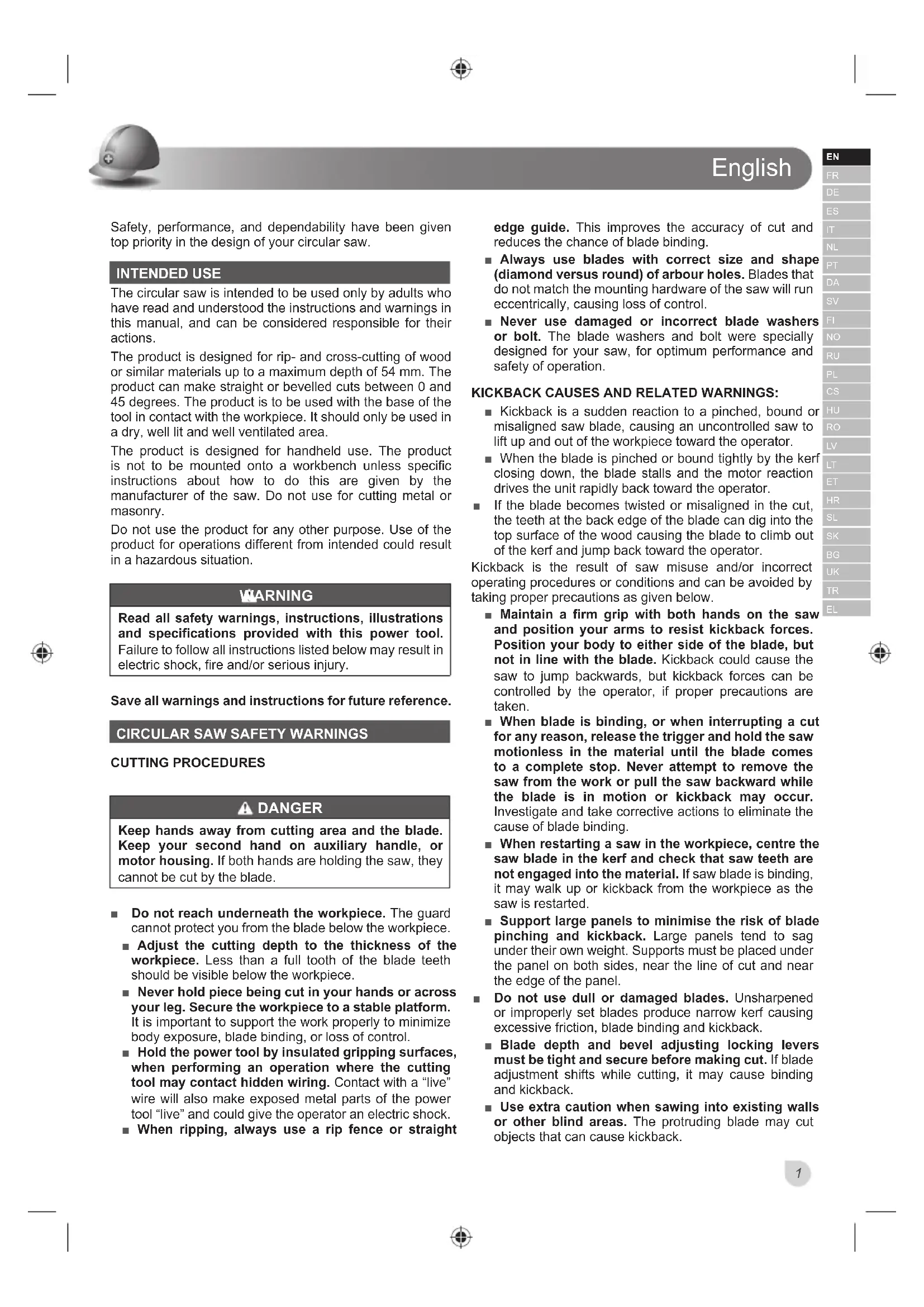 Safety, performance, and dependability have been given top priority in the design of your circular saw. INTENDED USE The circular saw is intended to be used only by adults who have read and understood the instructions and warnings in this manual, and can be considered responsible for their actions. The product is designed for rip- and cross-cutting of wood or similar materials up to a maximum depth of 54 mm. The product can make straight or bevelled cuts between 0 and 45 degrees. The product is to be used with the base of the tool in contact with the workpiece. It should only be used in a dry, well lit and well ventilated area. The product is designed for handheld use. The product is not to be mounted onto a workbench unless specific instructions about how to do this are given by the manufacturer of the saw. Do not use for cutting metal or masonry. Do not use the product for any other purpose. Use of the product for operations different from intended could result in a hazardous situation. WARNING Read all safety warnings, instructions, illustrations and specifications provided with this power tool. Failure to follow all instructions listed below may result in electric shock, fire and/or serious injury. Save all warnings and instructions for future reference.