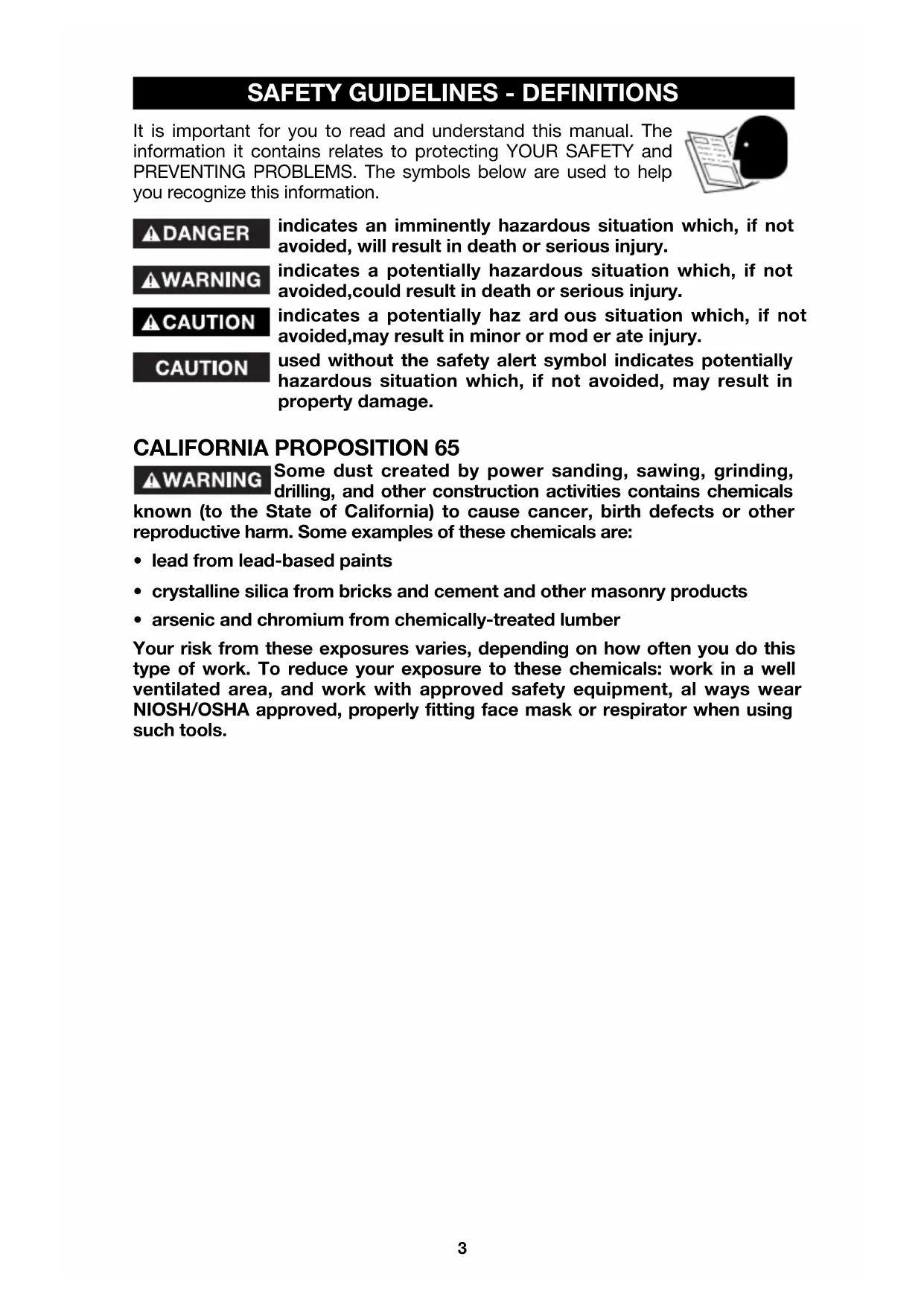 - arsenic and chromium from chemically-treated lumber Your risk from these exposures varies, depending on how often you do this type of work. To reduce your exposure to these chemicals: work in a well ventilated area, and work with approved safety equipment, al ways wear NIOSH/OSHA approved, properly fit ting face mask or res pi ra tor when us ing such tools. CALIFORNIA PROPOSITION 65
