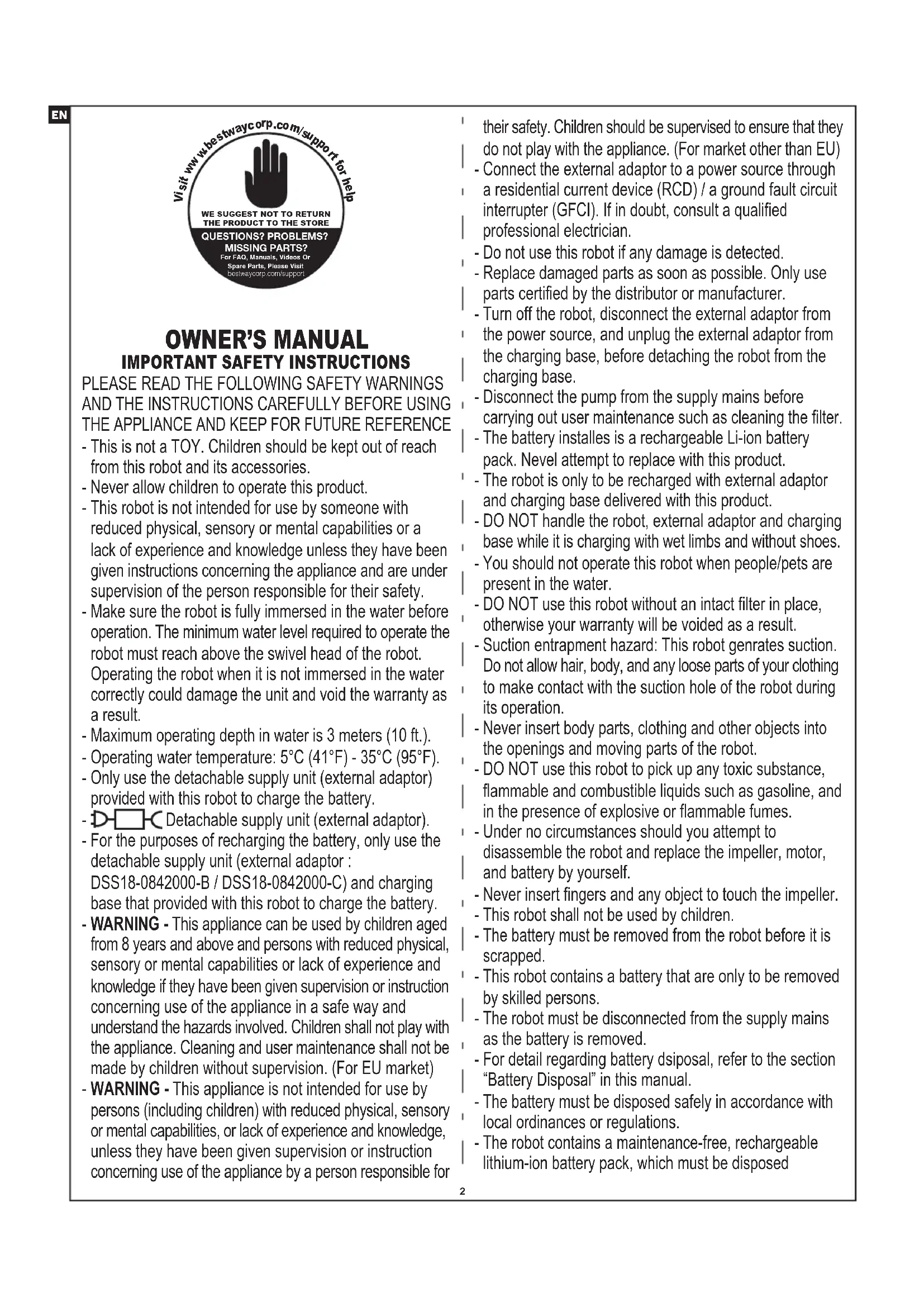 THE APPLIANCE AND KEEP FOR FUTURE REFERENCE - This is not a TOY. Children should be kept out of reach from this robot and its accessories. - Never allow children to operate this product. - This robot is not intended for use by someone with reduced physical, sensory or mental capabilities or a lack of experience and knowledge unless they have been given instructions concerning the appliance and are under supervision of the person responsible for their safety. - Make sure the robot is fully immersed in the water before operation. The minimum water level required to operate the robot must reach above the swivel head of the robot. Operating the robot when it is not immersed in the water correctly could damage the unit and void the warranty as a result. - Maximum operating depth in water is 3 meters (10 ft.). - Operating water temperature: 5°C (41°F) - 35°C (95°F). - Only use the detachable supply unit (external adaptor) provided with this robot to charge the battery. - Detachable supply unit (external adaptor). - For the purposes of recharging the battery, only use the detachable supply unit (external adaptor : DSS18-0842000-B / DSS18-0842000-C) and charging base that provided with this robot to charge the battery. - WARNING - This appliance can be used by children aged from 8 years and above and persons with reduced physical, sensory or mental capabilities or lack of experience and knowledge if they have been given supervision or instruction concerning use of the appliance in a safe way and understand the hazards involved. Children shall not play with the appliance. Cleaning and user maintenance shall not be made by children without supervision. (For EU market) - WARNING - This appliance is not intended for use by persons (including children) with reduced physical, sensory or mental capabilities, or lack of experience and knowledge, unless they have been given supervision or instruction concerning use of the appliance by a person responsible for their safety. Children should be supervised to ensure that they do not play with the appliance. (For market other than EU) - Connect the external adaptor to a power source through a residential current device (RCD) / a ground fault circuit interrupter (GFCI). If in doubt, consult a qualified professional electrician. - Do not use this robot if any damage is detected. - Replace damaged parts as soon as possible. Only use parts certified by the distributor or manufacturer. - Turn off the robot, disconnect the external adaptor from the power source, and unplug the external adaptor from the charging base, before detaching the robot from the charging base. - Disconnect the pump from the supply mains before carrying out user maintenance such as cleaning the filter. - The battery installes is a rechargeable Li-ion battery pack. Nevel attempt to replace with this product. - The robot is only to be recharged with external adaptor and charging base delivered with this product. - DO NOT handle the robot, external adaptor and charging base while it is charging with wet limbs and without shoes. - You should not operate this robot when people/pets are present in the water. - DO NOT use this robot without an intact filter in place, otherwise your warranty will be voided as a result. - Suction entrapment hazard: This robot genrates suction. Do not allow hair, body, and any loose parts of your clothing to make contact with the suction hole of the robot during its operation. - Never insert body parts, clothing and other objects into the openings and moving parts of the robot. - DO NOT use this robot to pick up any toxic substance, flammable and combustible liquids such as gasoline, and in the presence of explosive or flammable fumes. - Under no circumstances should you attempt to disassemble the robot and replace the impeller, motor, and battery by yourself. - Never insert fingers and any object to touch the impeller. - This robot shall not be used by children. - The battery must be removed from the robot before it is scrapped. - This robot contains a battery that are only to be removed by skilled persons. - The robot must be disconnected from the supply mains as the battery is removed. - For detail regarding battery dsiposal, refer to the section “Battery Disposal” in this manual. - The battery must be disposed safely in accordance with local ordinances or regulations. - The robot contains a maintenance-free, rechargeable lithium-ion battery pack, which must be disposed WE SUGGEST NOT TO RETURNTHE PRODUCT TO THE STOREQUESTIONS? PROBLEMS?MISSING PARTS? For FAQ, Manuals, Videos Or Spare Parts, Please Visitbestwaycorp.com/support