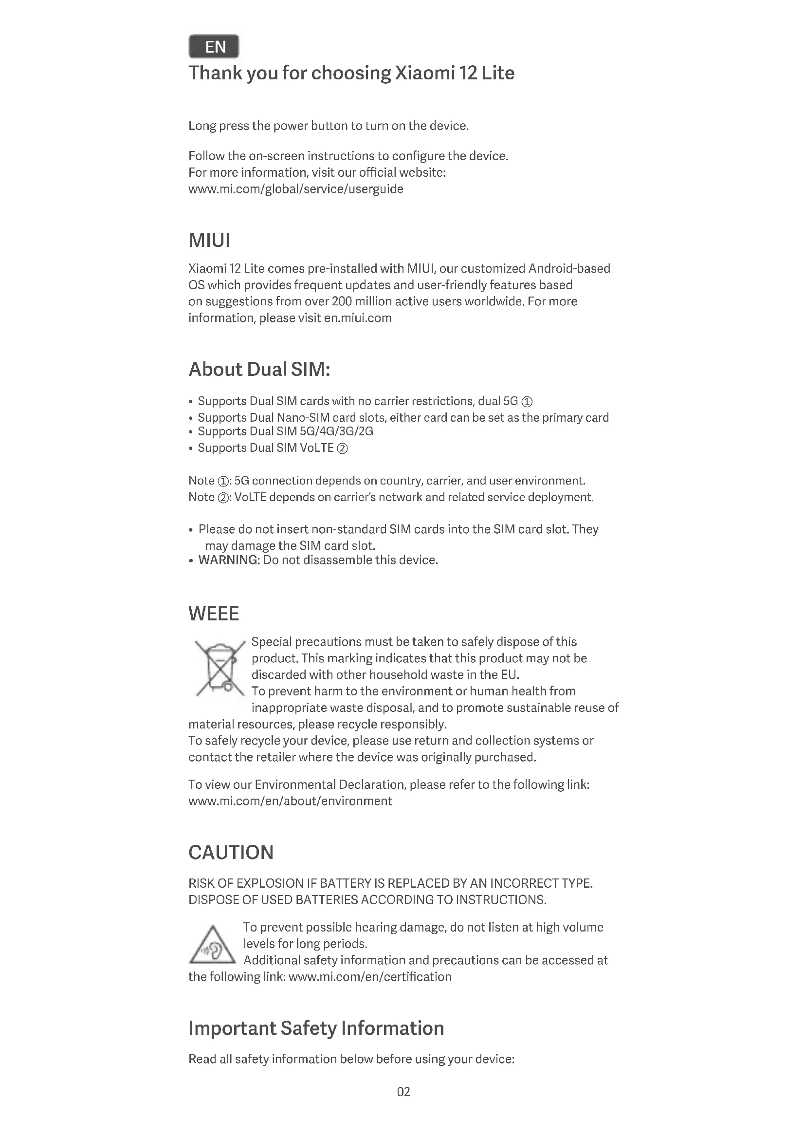 01Thank you for choosing Xiaomi 12 Lite Long press the power buon to turn on the device. Follow the on-screen instructions to configure the device. For more information, visit our official website: www.mi.com/global/service/userguide MIUI Xiaomi 12 Lite comes pre-installed with MIUI, our customized Android-based OS which provides frequent updates and user-friendly features based on suggestions from over 200 million active users worldwide. For more information, please visit en.miui.com About Dual SIM: