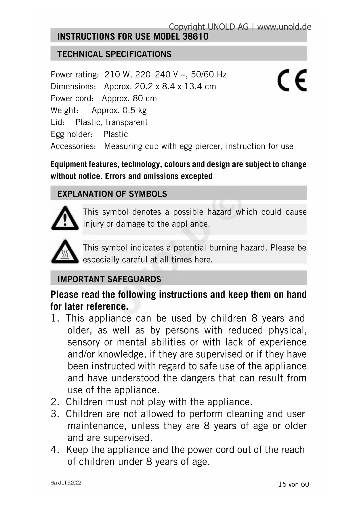 Download the instructions for your Egg cooker in PDF format for free! Find your manual Mini 38610 - UNOLD and take your electronic device back in hand. On this page are published all the documents necessary for the use of your device. Mini 38610 by UNOLD.