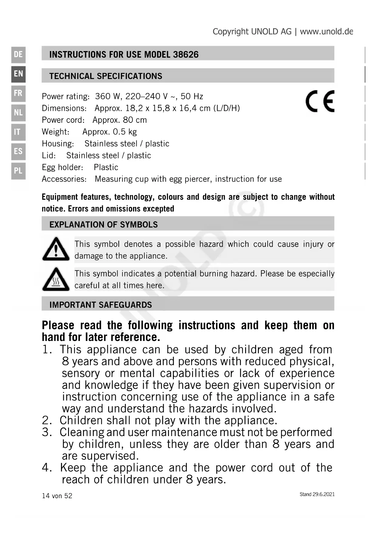 This symbol denotes a possible hazard which could cause injury or damage to the appliance. This symbol indicates a potential burning hazard. Please be especially careful at all times here. Copyright UNOLD AG | www.unold.de UNOLD ©Stand 29.6.2021 15 von 52