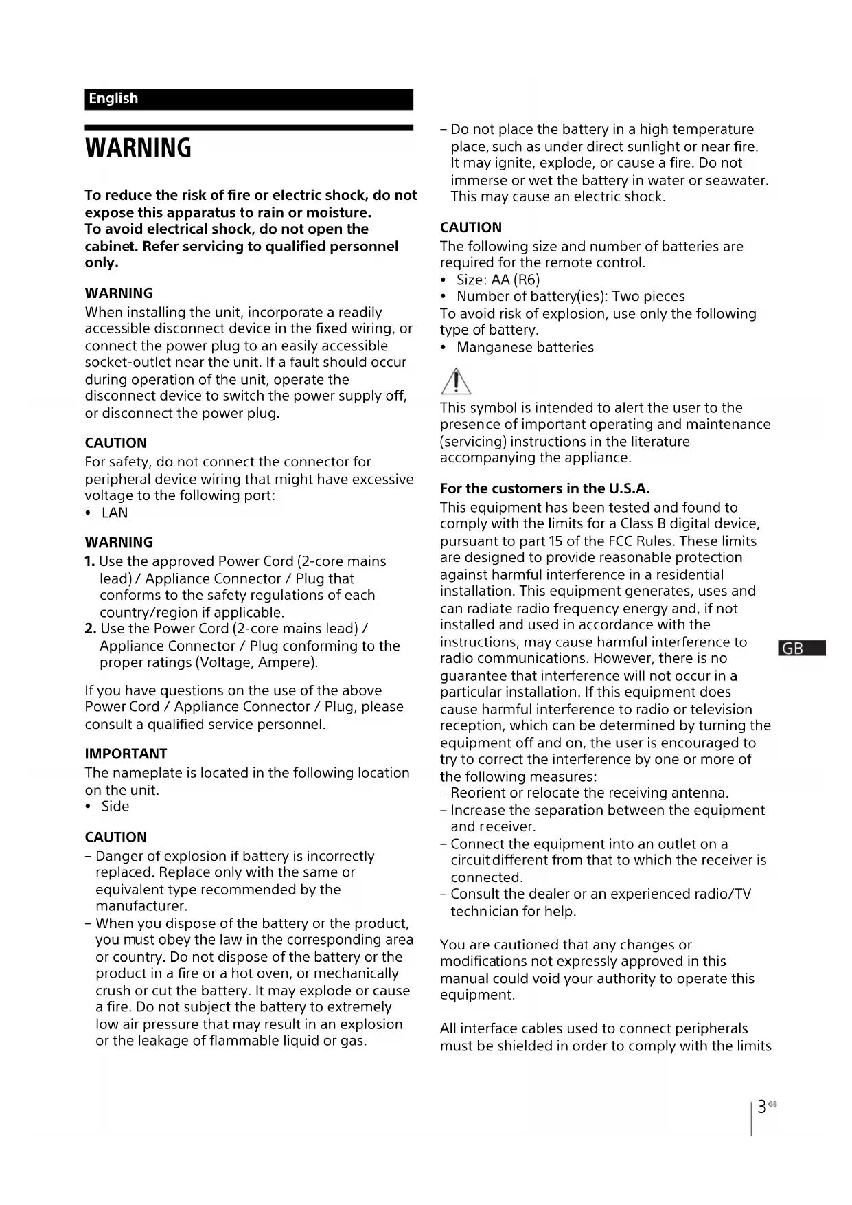 Applian ce Connector / Plug conforming to the proper ratings (Voltage, Ampere). If you have questions on the use of the above Power Cord / Appliance Connector / Plug, please consult a qualified service personnel. IMPORTANT The nameplate is located in the following location on the unit. Side CAUTION – Danger of explosion if battery is incorrectly replac ed. Replace only with the same or equivalent type recommended by the manufacturer. – When you dispose of the battery or the product, you m ust obey the law in the corresponding area or country. Do not dispose of the battery or the product in a fire or a hot oven, or mechanically crush or cut the battery. It may explode or cause a fire. Do not subject the battery to extremely low air pressure that may result in an explosion or the leakage of flammable liquid or gas. – Do not place the battery in a high temperature place, such as under direct sunlight or near fire. It may ignite, explode, or cause a fire. Do not immerse or wet the battery in water or seawater. This may cause an electric shock. CAUTION The following size and number of batteries are require d for the remote control. Size: AA (R6) Number of battery(ies): Two pieces To avoid risk of explosion, use only the following type o f battery. Manganese batteries This symbol is intended to alert the user to the presen ce of important operating and maintenance (servicing) instructions in the literature accompanying the appliance. For the customers in the U.S.A. This equipment has been tested and found to