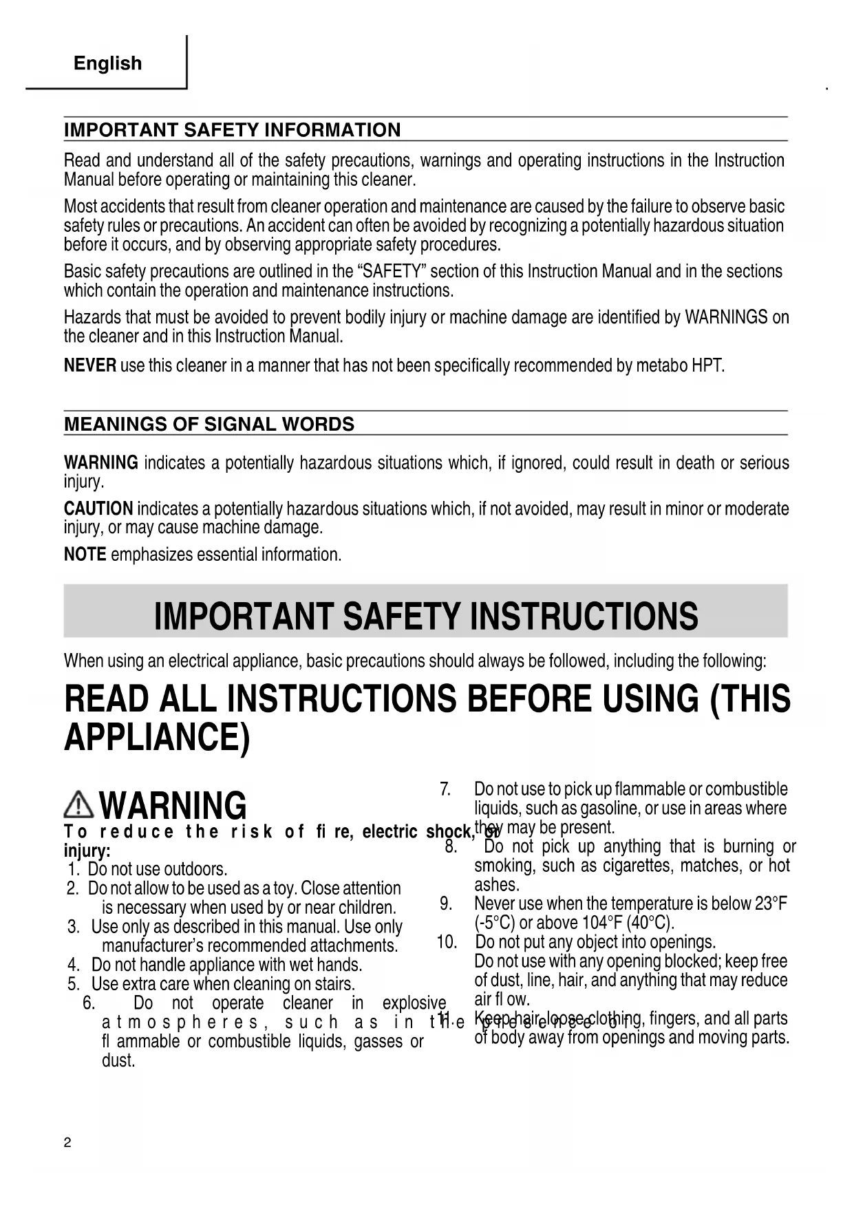 operating abnormally. If the cleaner appears to be operating unusually, making strange noises, or otherwise appears defective, stop using it immediately and arrange for repairs by a metabo HPT authorized service center.