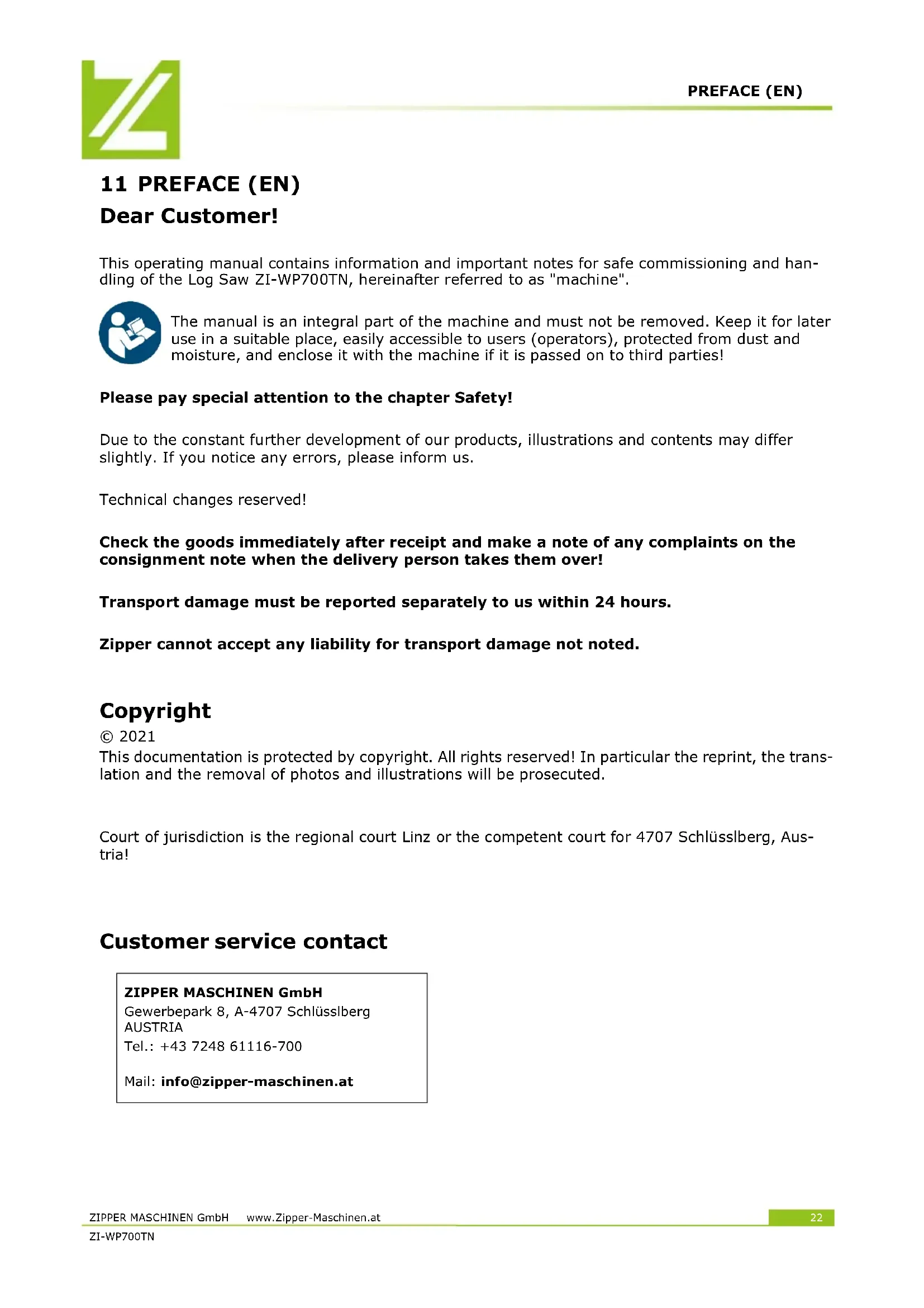 - Sägeblatt tauschenPREFACE (EN) ZIPPER MASCHINEN GmbH www.Zipper-Maschinen.at 22 ZI-WP700TN 11 PREFACE (EN) Dear Customer! This operating manual contains information and important notes for safe commissioning and han- dling of the Log Saw ZI-WP700TN, hereinafter referred to as "machine". The manual is an integral part of the machine and must not be removed. Keep it for later use in a suitable place, easily accessible to users (operators), protected from dust and moisture, and enclose it with the machine if it is passed on to third parties! Please pay special attention to the chapter Safety! Due to the constant further development of our products, illustrations and contents may differ slightly. If you notice any errors, please inform us. Technical changes reserved! Check the goods immediately after receipt and make a note of any complaints on the consignment note when the delivery person takes them over! Transport damage must be reported separately to us within 24 hours. Zipper cannot accept any liability for transport damage not noted.